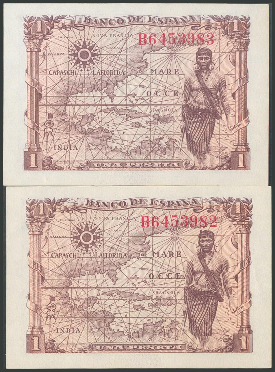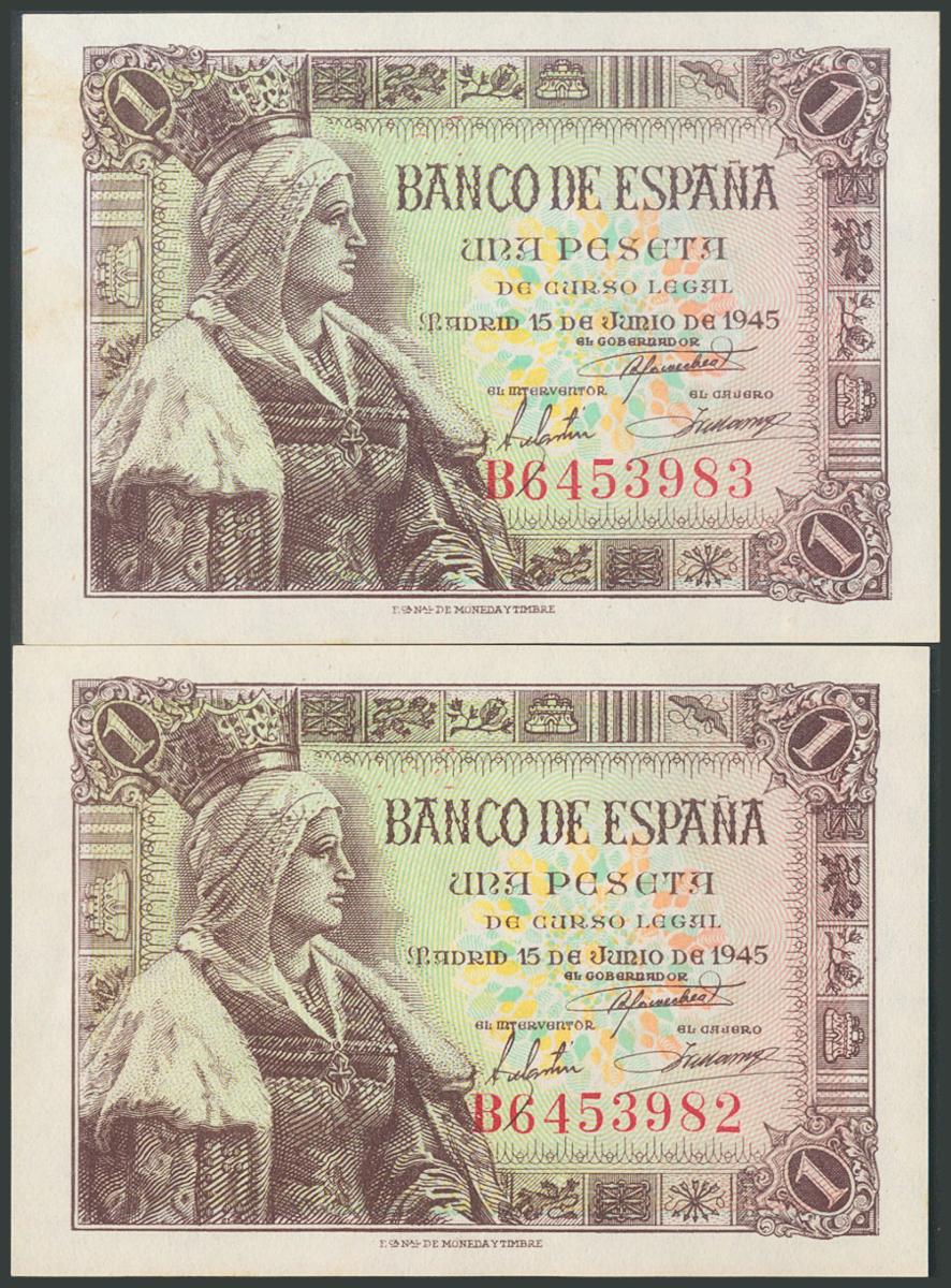 1 Peseta. 15 de Junio de 1945. Pareja correlativa. Serie B. (Edifil 2017: 448a). SC-.
