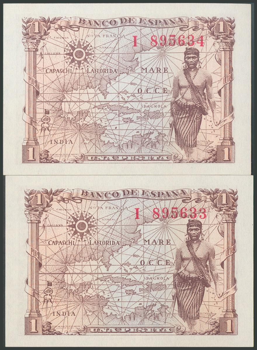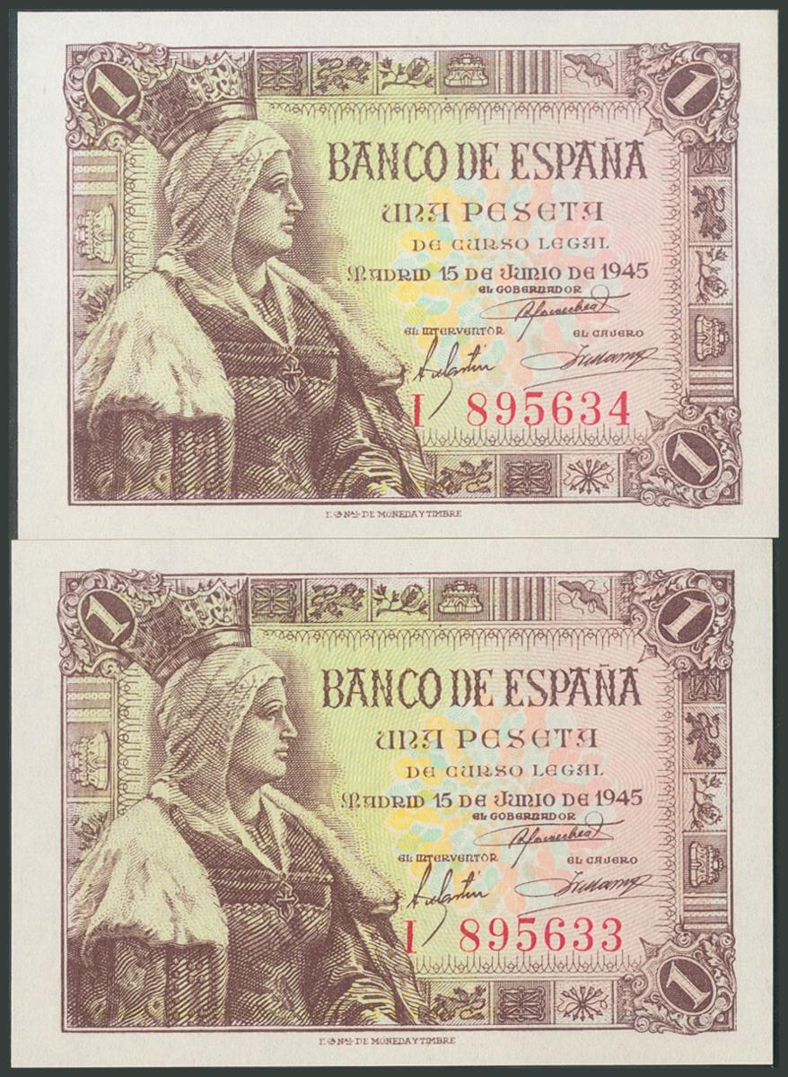 1 Peseta. 15 de Junio de 1945. Pareja correlativa. Serie I. (Edifil 2017: 448a). Apresto original. SC.