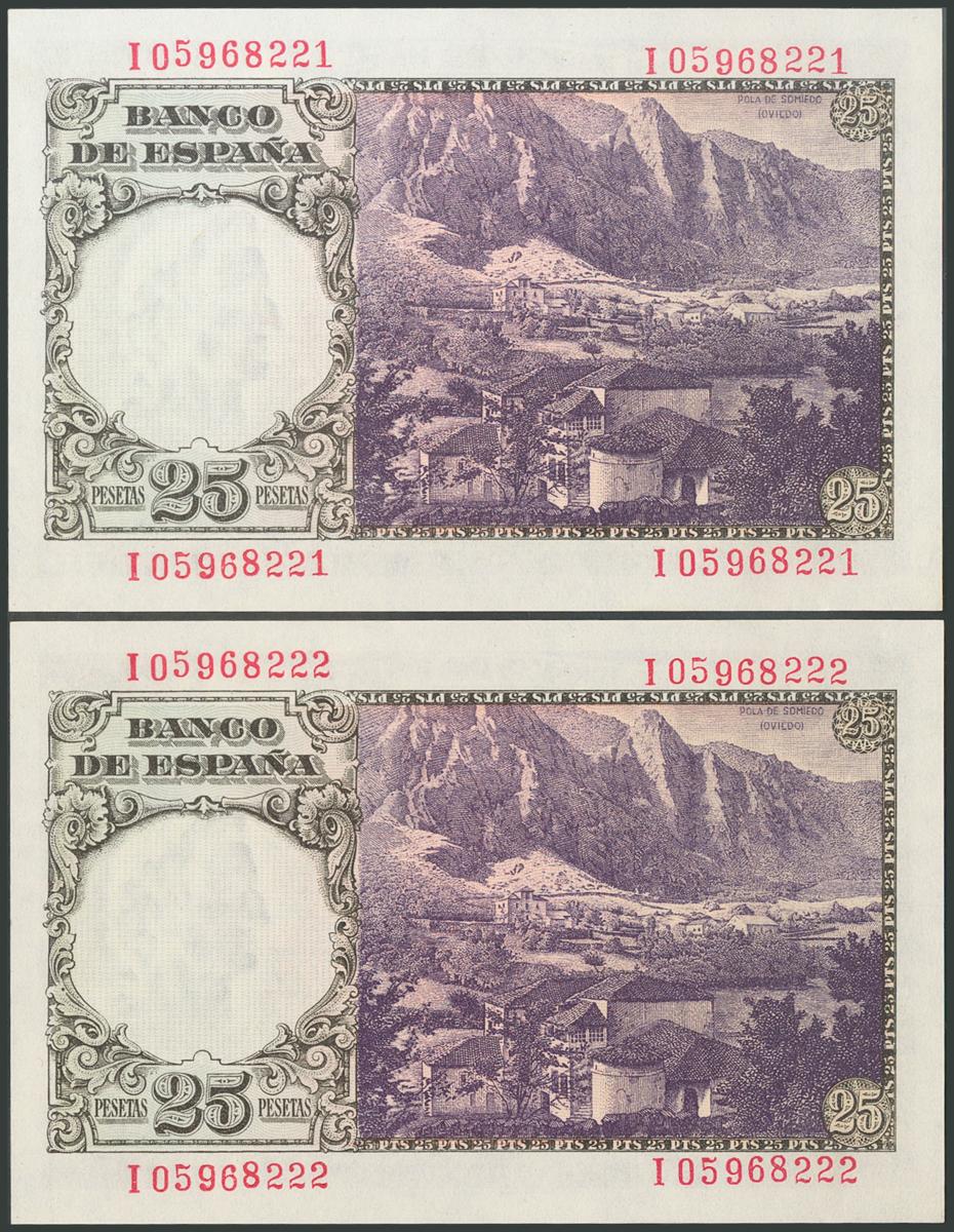 25 Pesetas. 19 de Febrero de 1946. Pareja correlativa. Serie I. (Edifil 2017: 450a). Apresto original. SC.