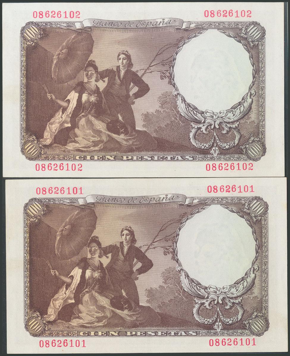 100 Pesetas. 19 de Febrero de 1946. Pareja correlativa. Sin serie. (Edifil 2017: 451). EBC+.