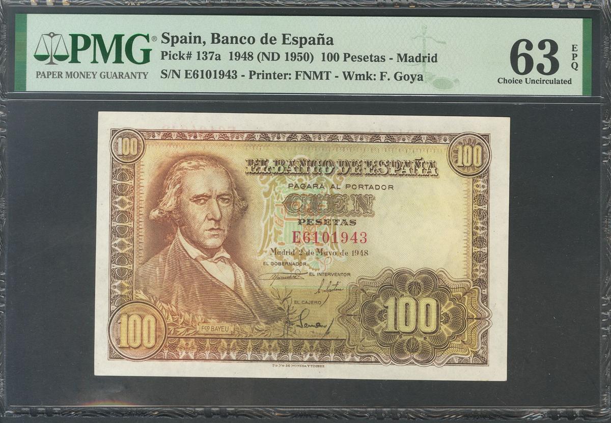 100 Pesetas. 2 de Mayo de 1948. Serie E. (Edifil 2017: 456a). Apresto original. SC. Encapsulado 63EPQ.
