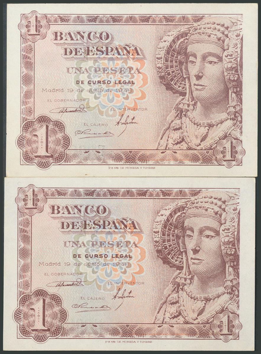 1 Peseta. 19 de Junio de 1948. Pareja correlativa. Serie E. (Edifil 2017: 457a). SC-.