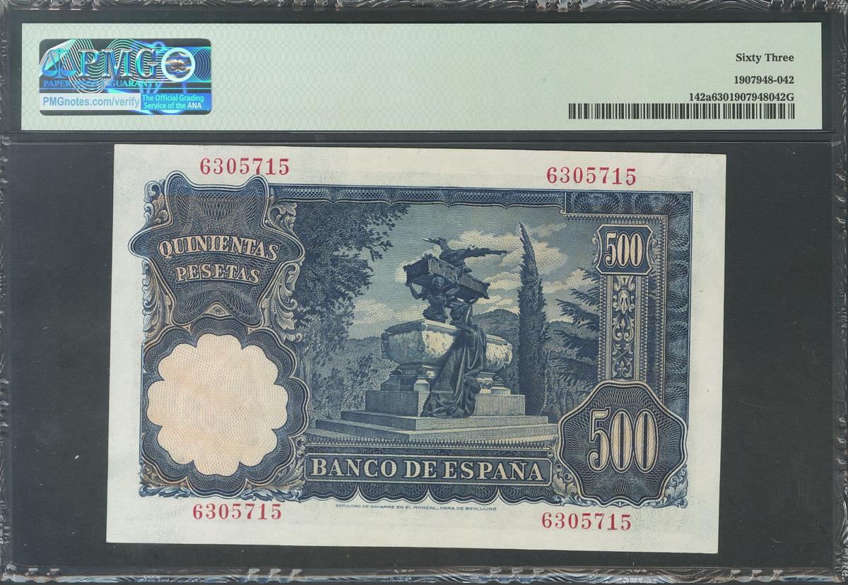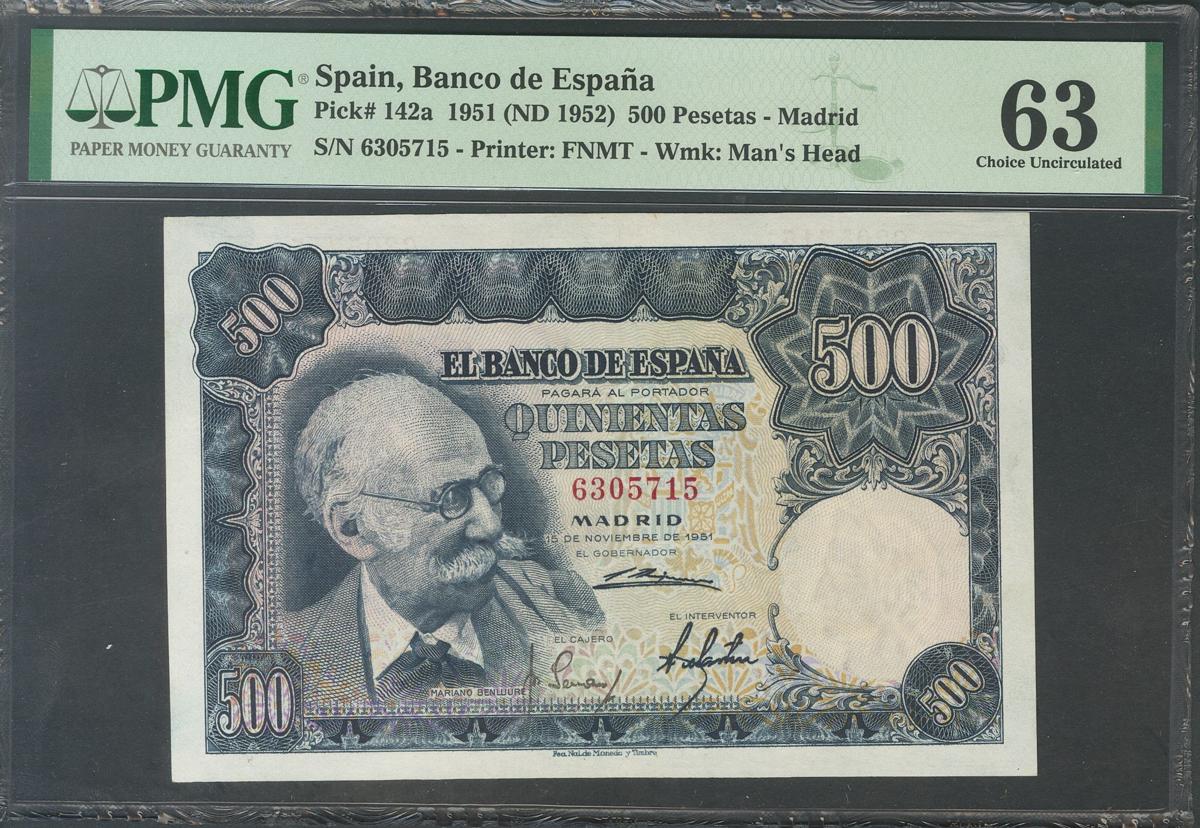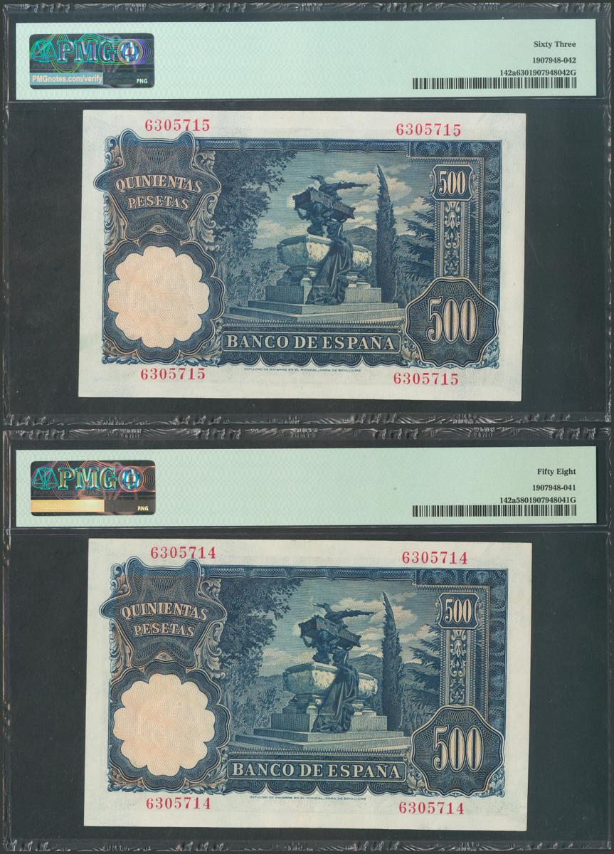 500 Pesetas. 15 de Noviembre de 1951. Pareja correlativa. Sin serie. (Edifil 2017: 460). Rara. SC/EBC+. Encapsulados PMG63 y PMG58, respectivamente.