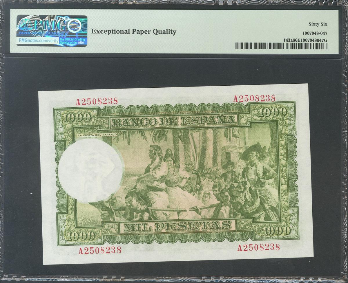 1000 Pesetas. 31 de Diciembre de 1951. Serie A. (Edifil 2017: 463a). Inusual en esta excepcional calidad conservando todo su apresto original. SC. Encapsulado PMG66EPQ.