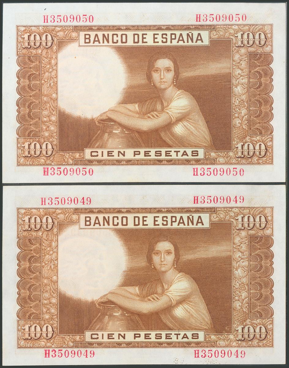 100 Pesetas. 7 de Abril de 1953. Pareja correlativa. Serie H. (Edifil 2017: 464b). Apresto original. SC-.