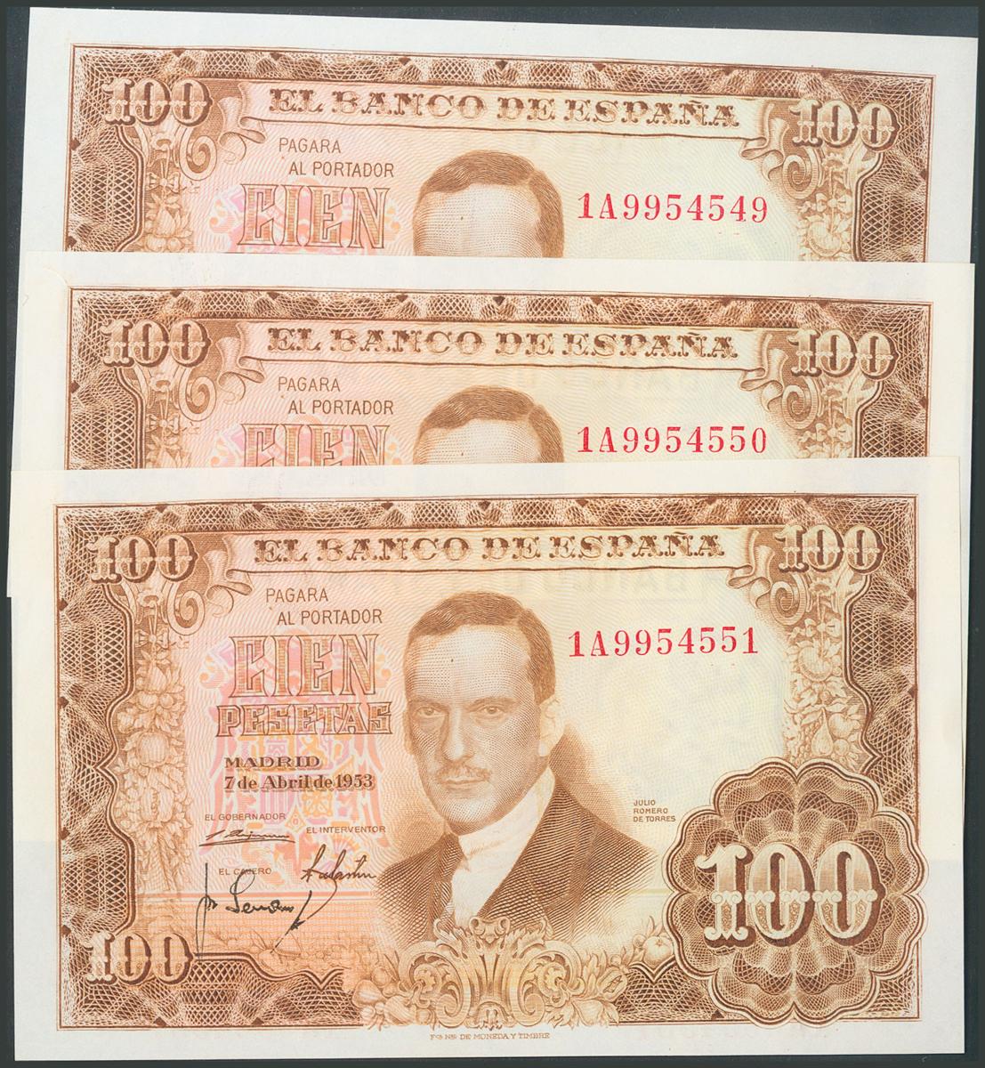 100 Pesetas. 7 de Abril de 1953. Trío correlativo. Serie 1A. (Edifil 2017: 464c). Apresto original. SC.