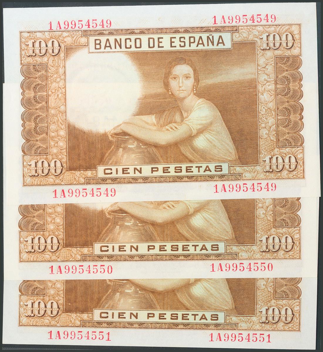 100 Pesetas. 7 de Abril de 1953. Trío correlativo. Serie 1A. (Edifil 2017: 464c). Apresto original. SC.