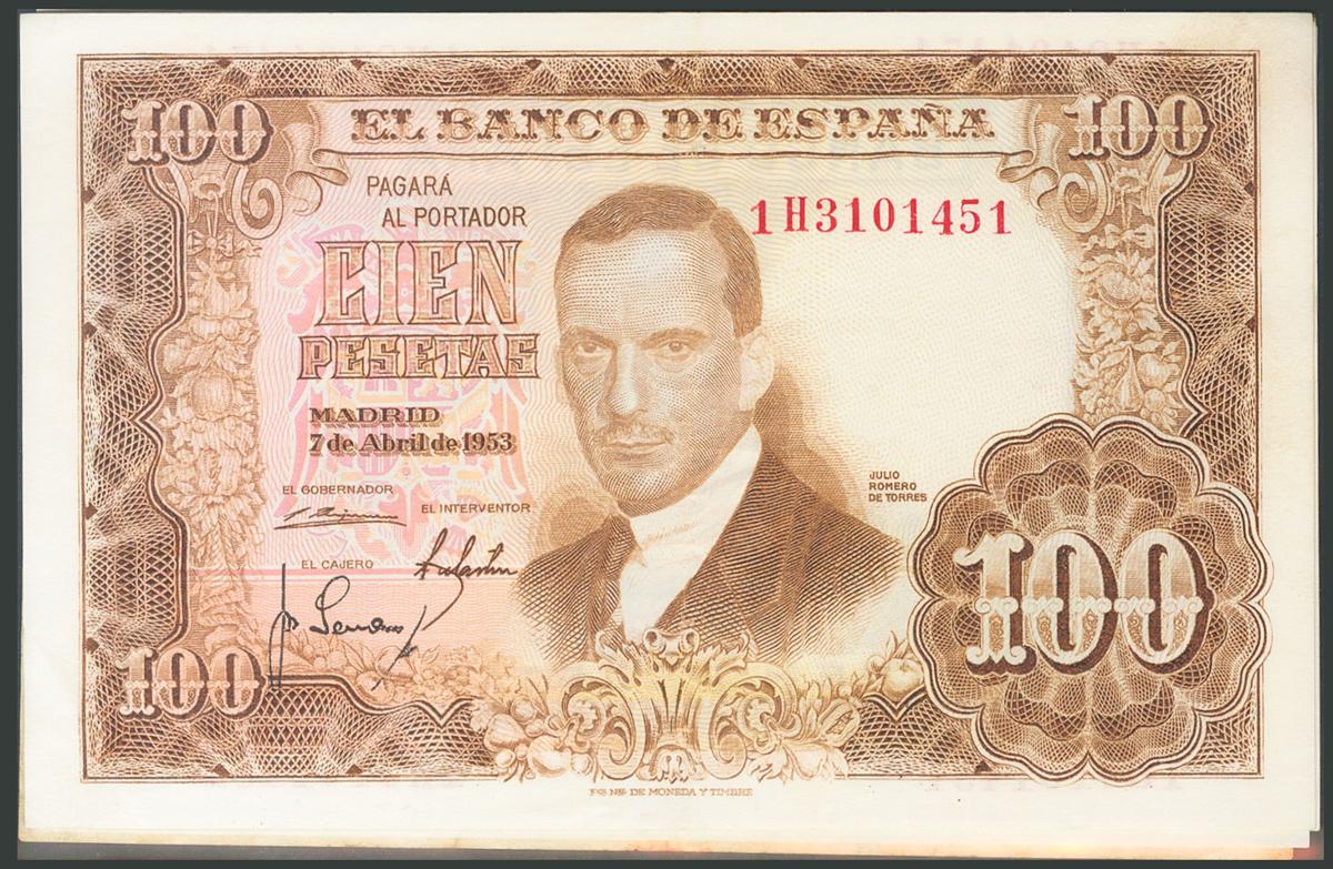 Conjunto de 12 billetes de 100 Pesetas emitidos el 7 de Abril de 1953, con las series 1H (10 billetes y correlativos), 2H y 3V. (Edifil 2017: 464c). SC-/MBC+.