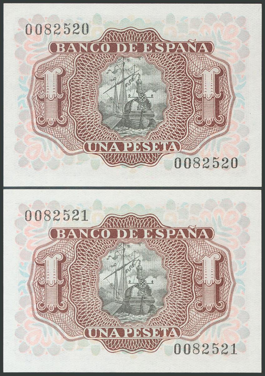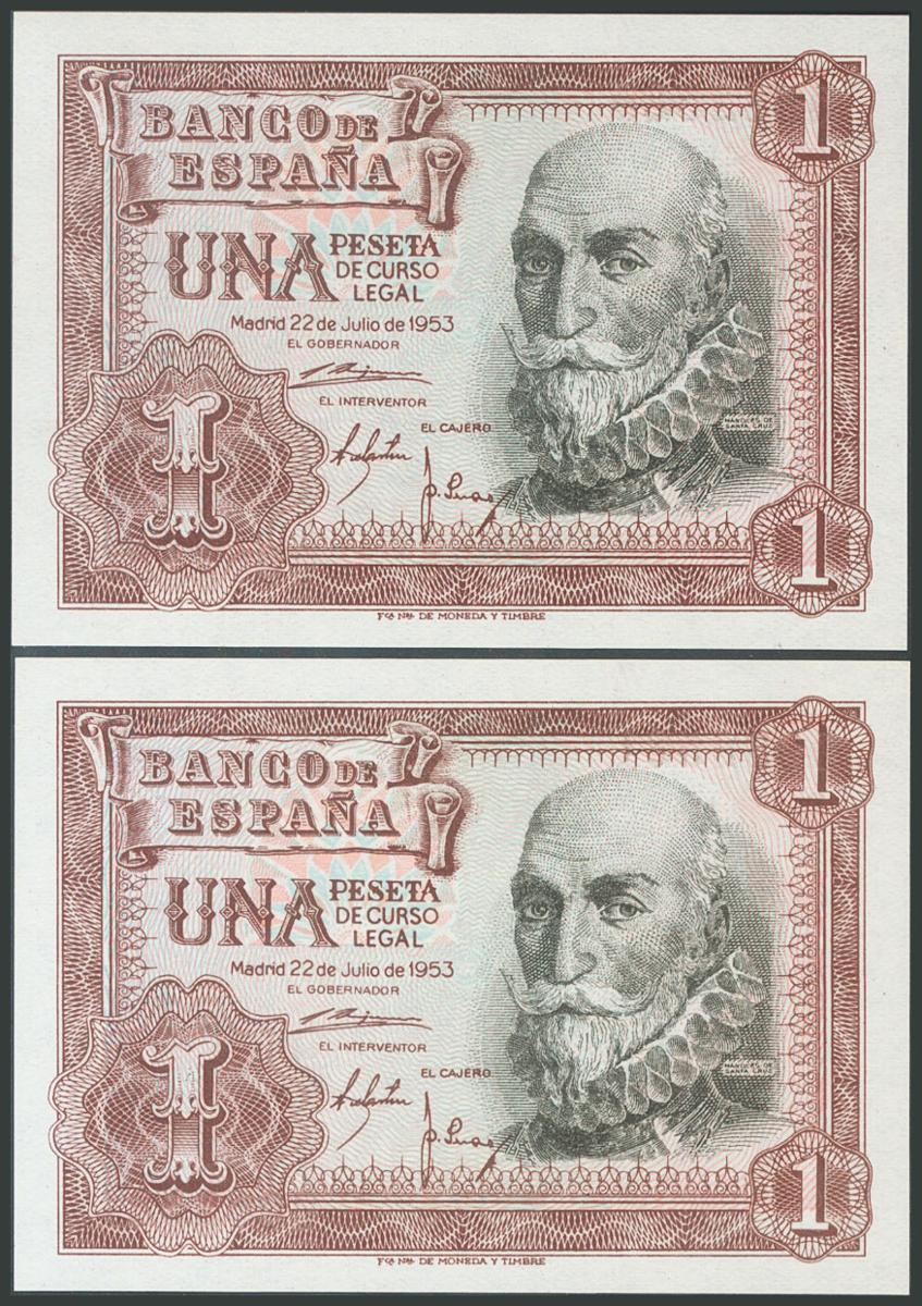 1 Peseta. 22 de Julio de 1953. Pareja correlativa. Sin serie. (Edifil 2017: 465). SC.