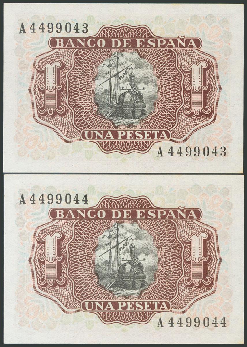1 Peseta. 22 de Julio de 1953. Pareja correlativa. Serie A. (Edifil 2017: 465a). Sombritas. SC-.