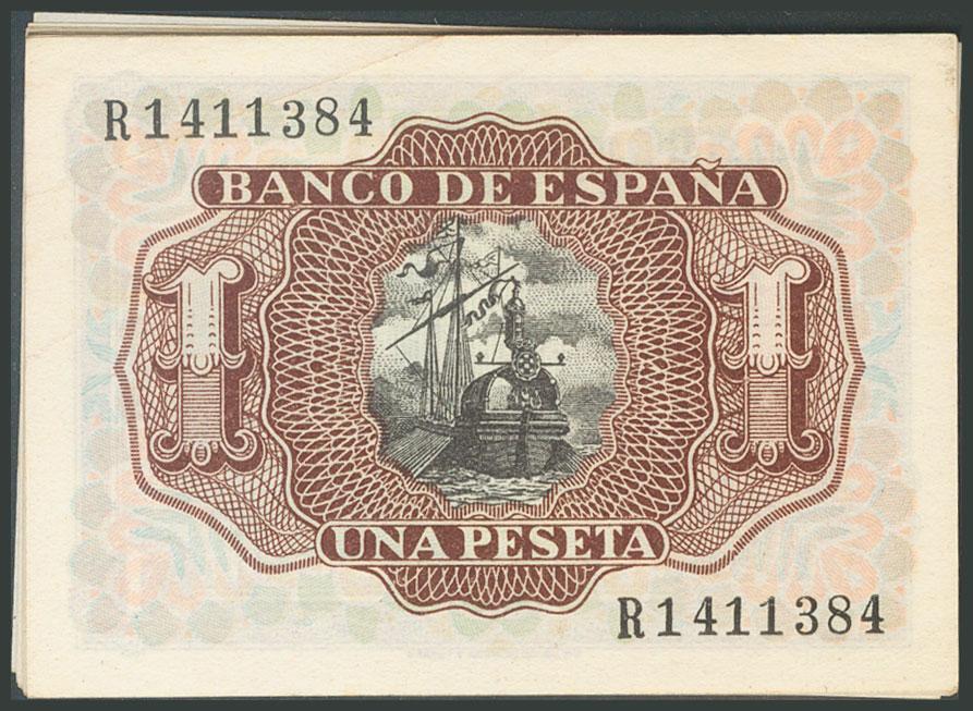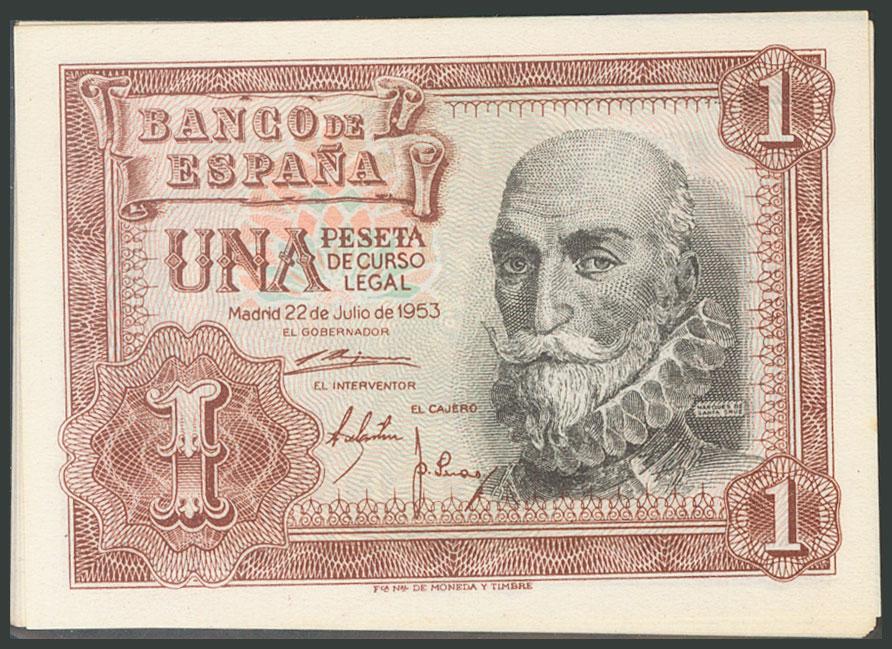 Conjunto de 10 billetes correlativos de 1 Peseta emitidos el 22 de Julio de 1953 con la serie R. (Edifil 2017: 465a). EBC-/SC.