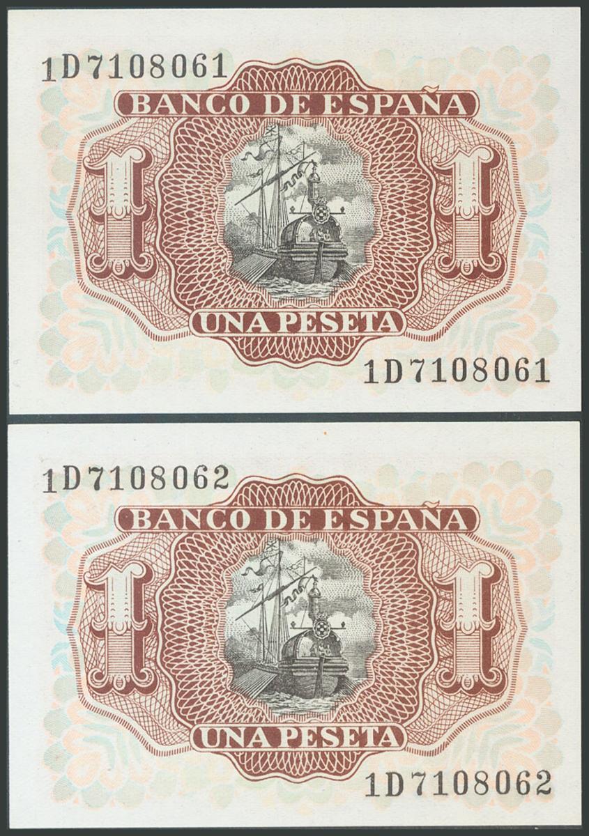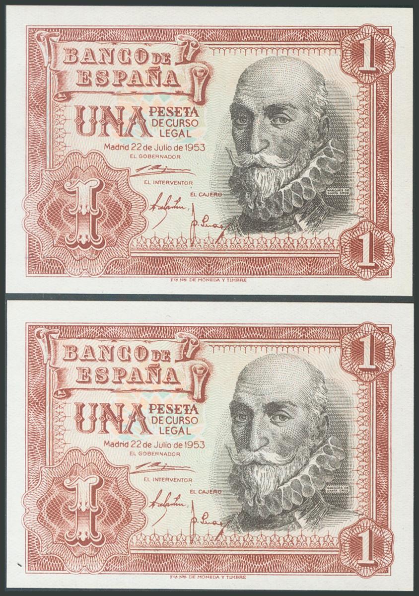 1 Peseta. 22 de Julio de 1953. Pareja correlativa. Serie 1D. (Edifil 2017: 465a). SC.