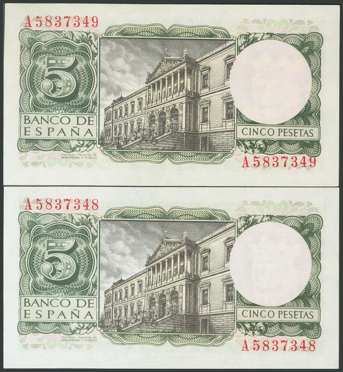 5 Pesetas. 22 de Julio de 1954. Pareja correlativa. Serie A. (Edifil 2017: 466a). SC.