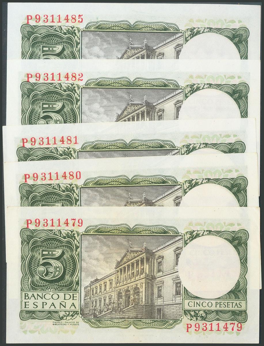Conjunto de 4 billetes correaltivos y uno casi correlativo de 5 Pesetas emitidos el 22 de Julio de 1954, con la serie P. (Edifil 2017: 466a). SC/EBC+.