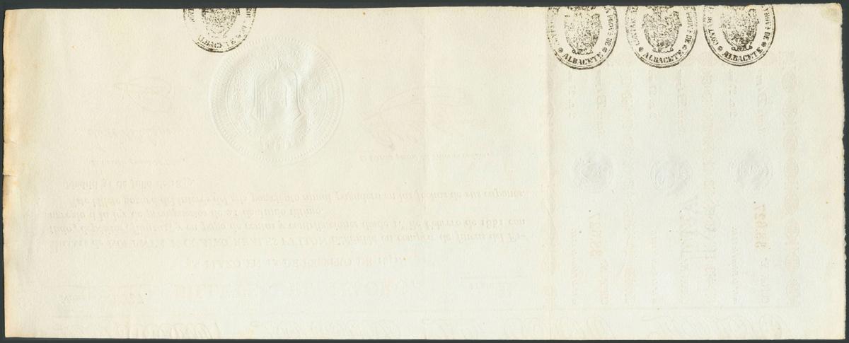 94 Reales de Vellón. 31 de Julio de 1849. Billete de la Dirección General del Tesoro Público. Serie B y con sello en seco. (Edifil 2017: 50). Estos billetes se utilizaron para transacciones con el Estado. EBC.