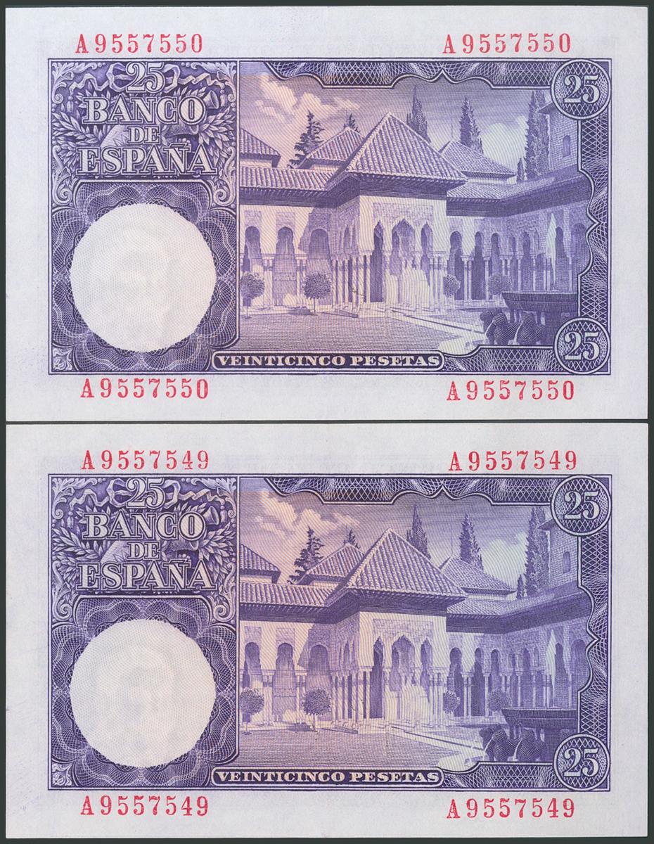 25 Pesetas. 22 de Julio de 1954. Pareja correlativa. Serie A. (Edifil 2017: 467a). Conserva todo su apresto original. SC.