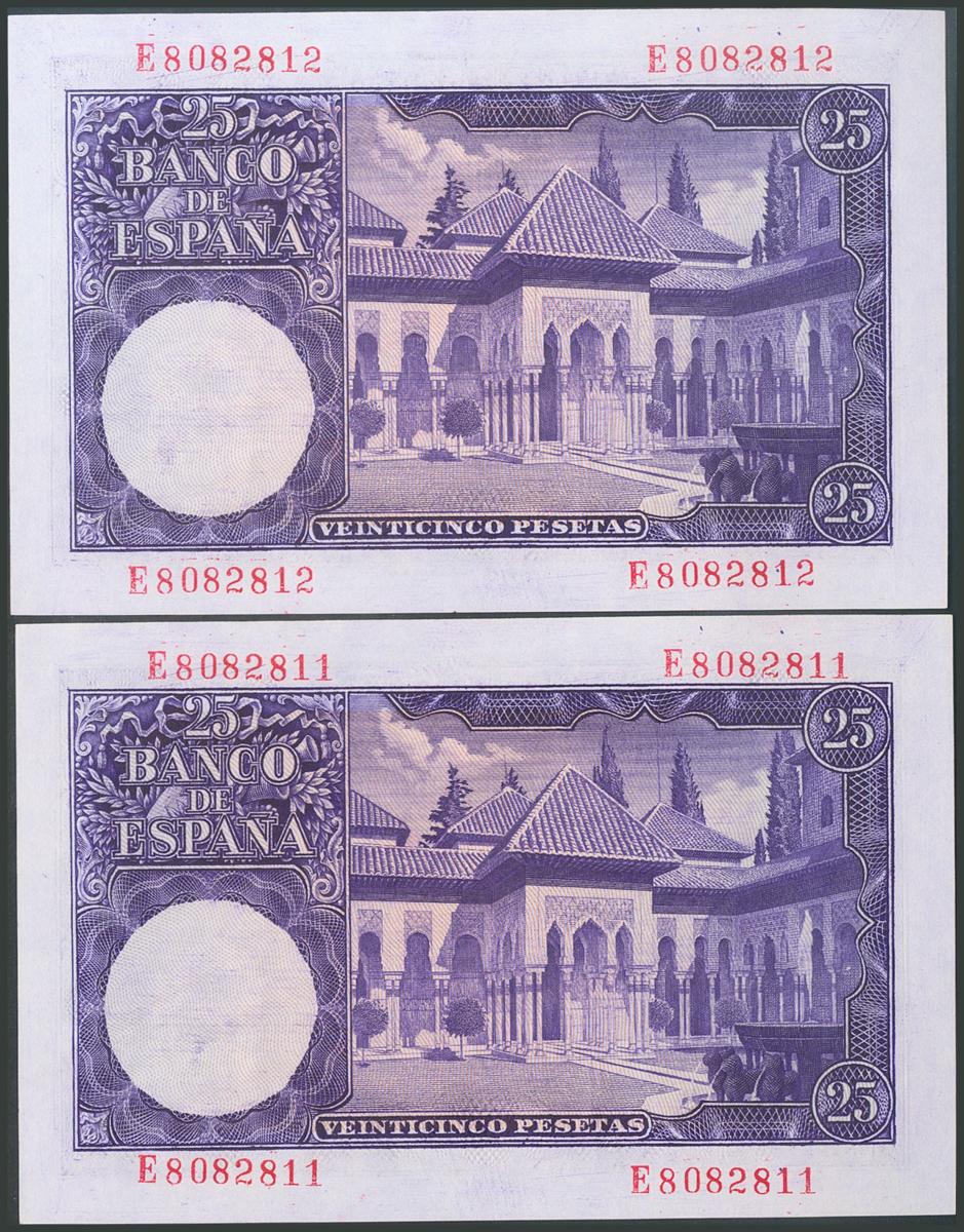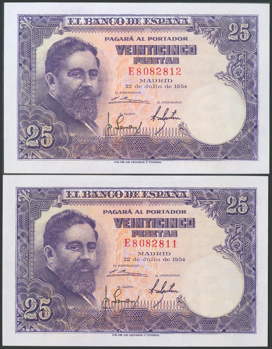 25 Pesetas. 22 de Julio de 1954. Pareja correlativa. Serie E. (Edifil 2017: 467a). Conserva todo su apresto original. SC.