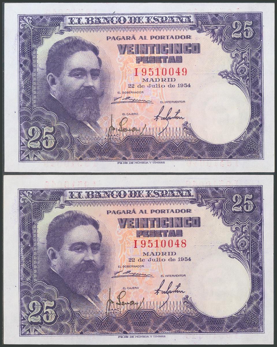 25 Pesetas. 22 de Julio de 1954. Pareja correlativa. Serie I. (Edifil 2017: 467a). Apresto original. SC-.