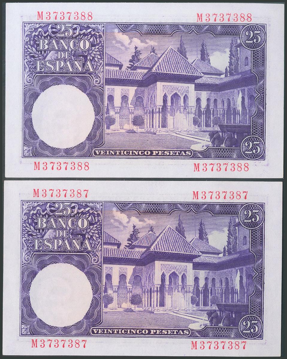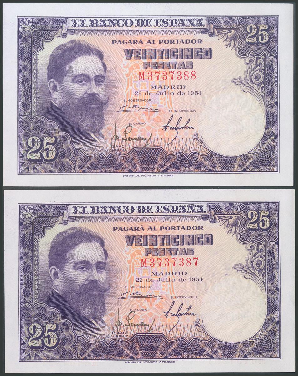 25 Pesetas. 22 de Julio de 1954. Pareja correlativa. Serie M. (Edifil 2017: 467a). Conserva todo su apresto original. SC.