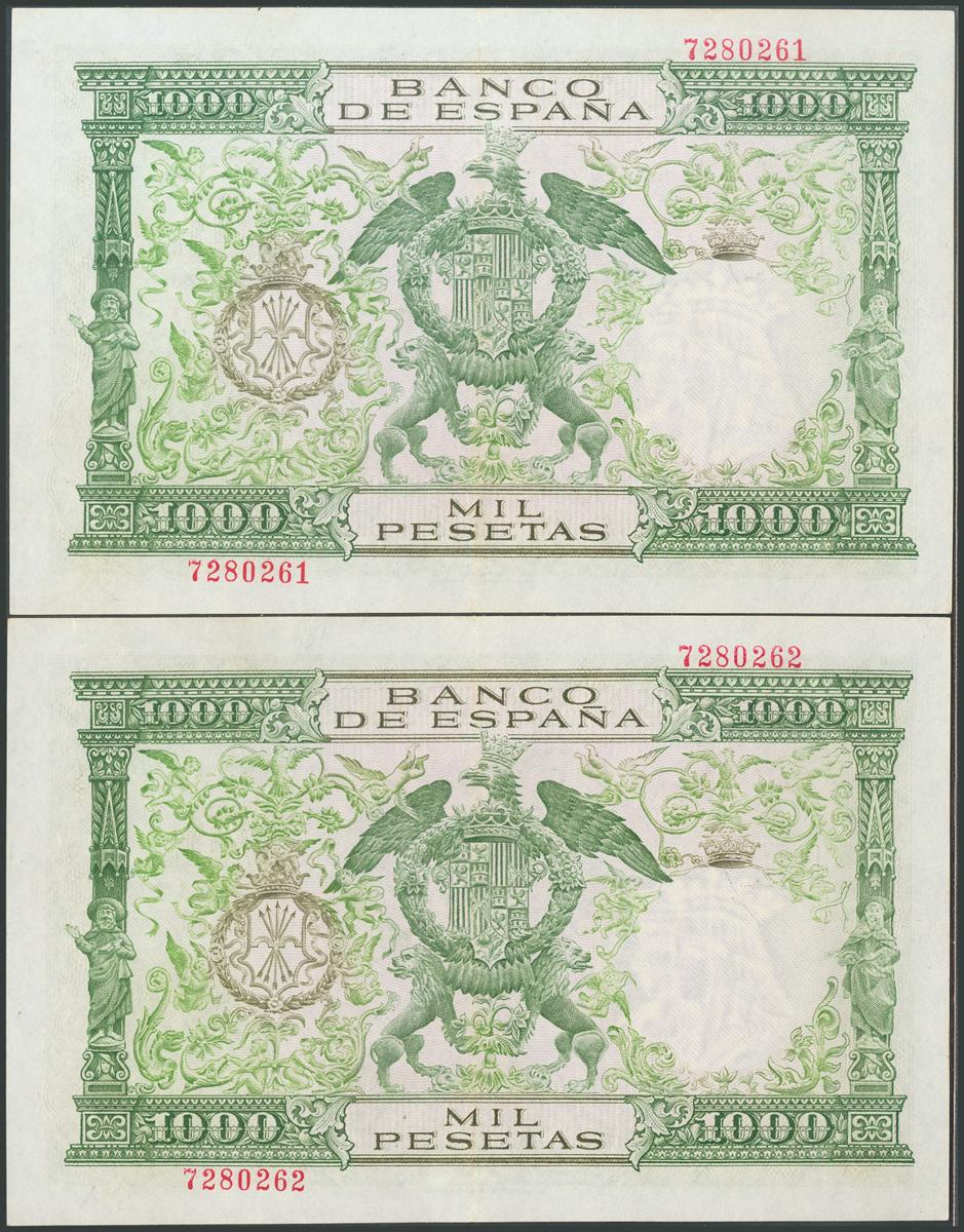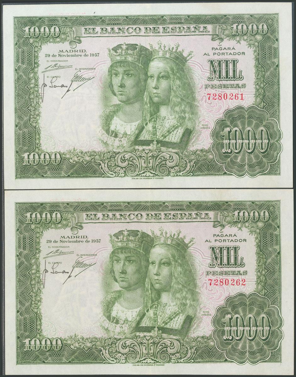 1000 Pesetas. 29 de Noviembre de 1957. Pareja correlativa. Sin serie. (Edifil 2017: 469). Muy rara pareja, conservando todo su apresto original, mínima roturita de 2 mm en el margen superior del billete con numeración más alta. EBC+.