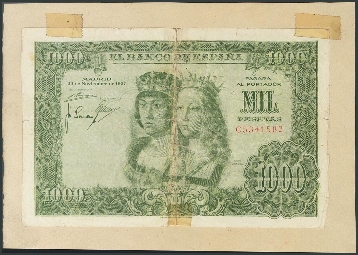 1000 Pesetas. 29 de Noviembre de 1957. Billete de propaganda Lotería Nacional del sorteo navideño de 1963 "Novedades Masip", emitido en la ciudad de Igualada y adherido con cinta a una hoja envejecida. RC.