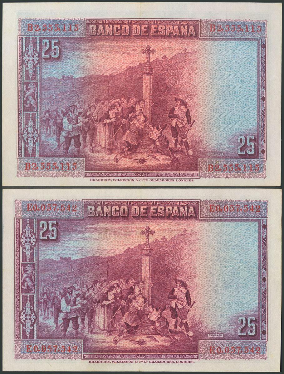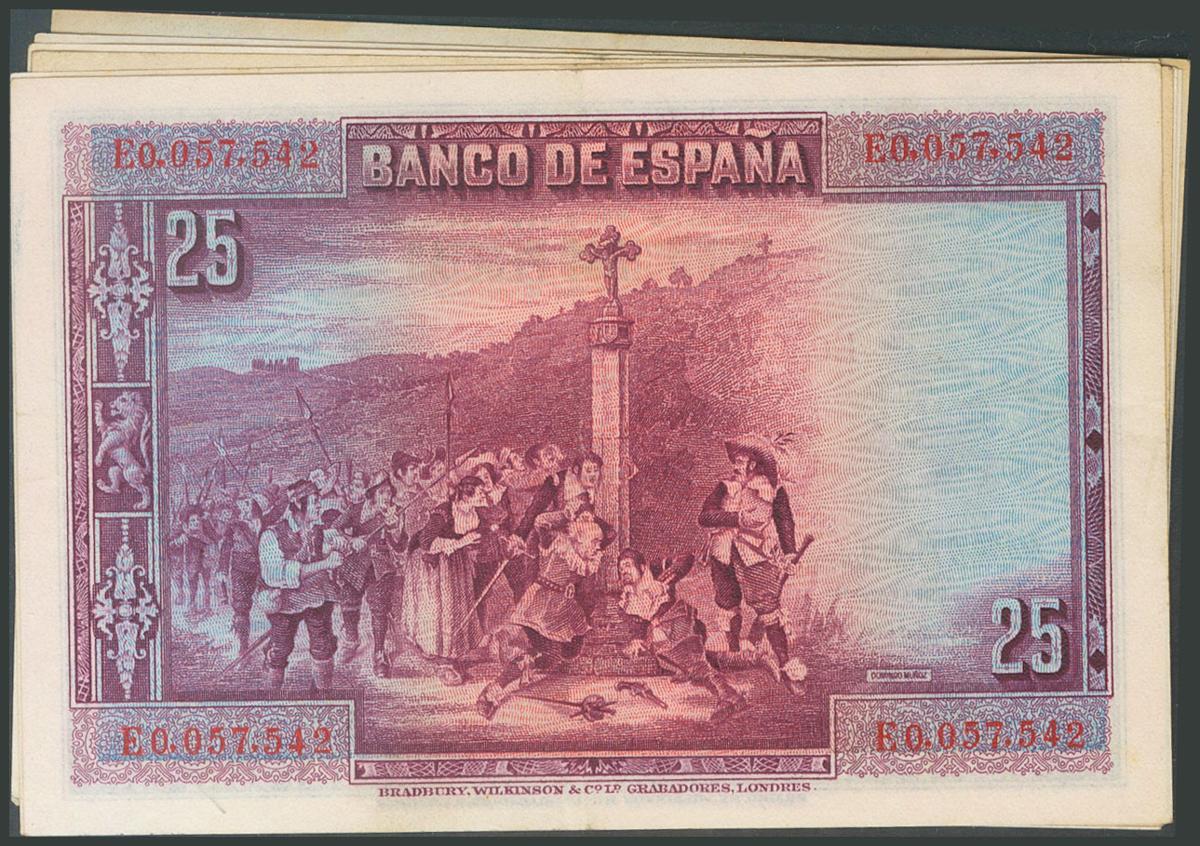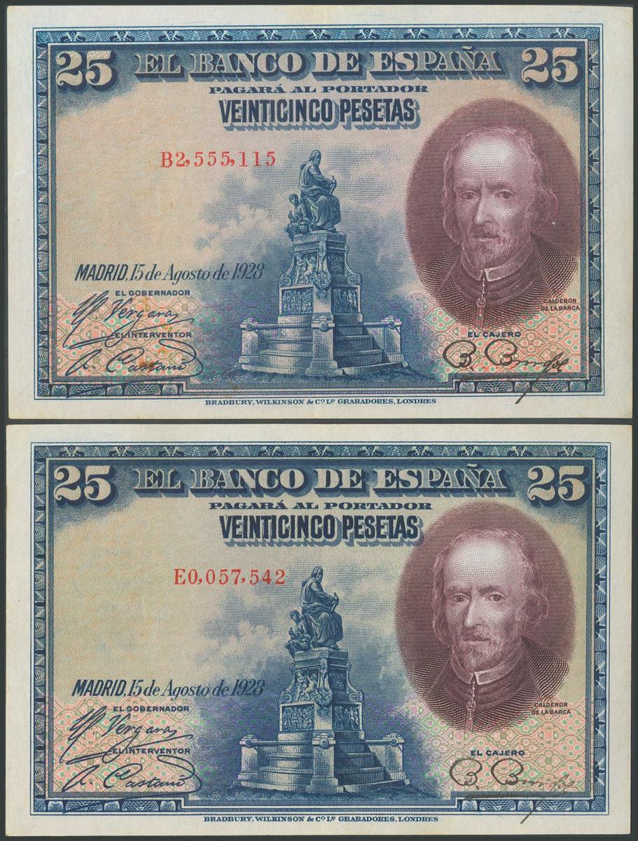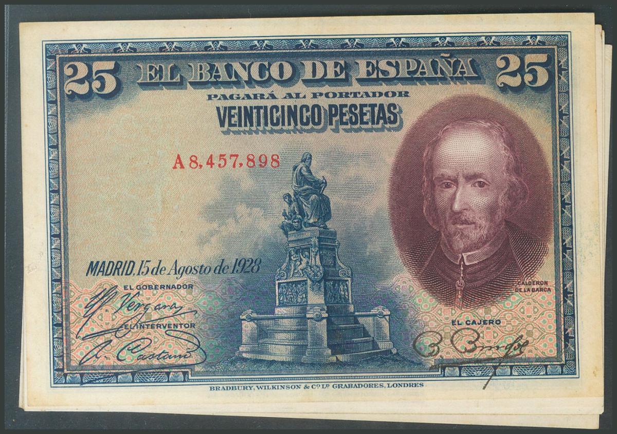 Conjunto de 6 billetes de 25 Pesetas emitidos el 15 de Agosto de 1928, con las series A, B, C, D y E y el sin serie. (Edifil 2017: 328, 353). SC/MBC+.