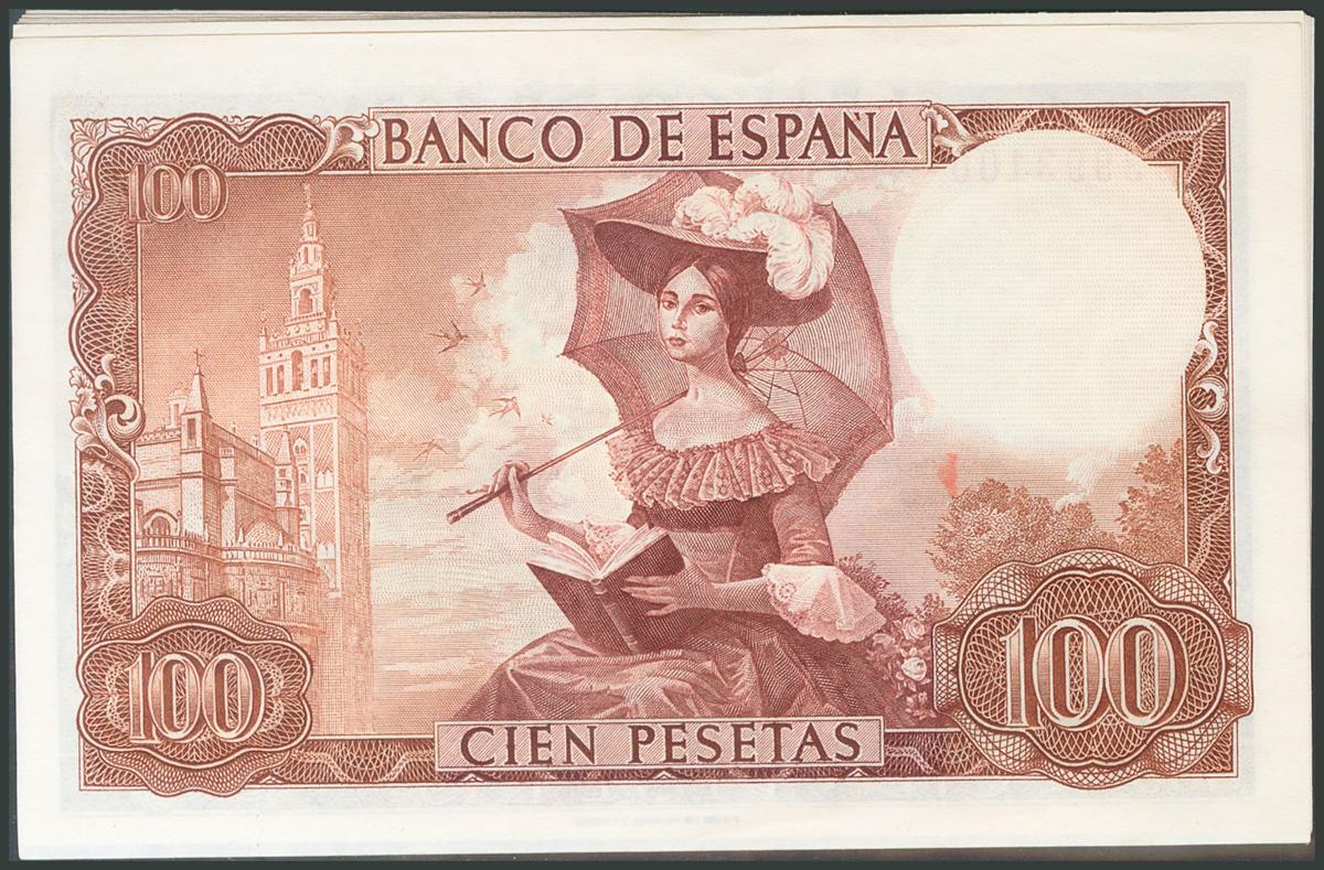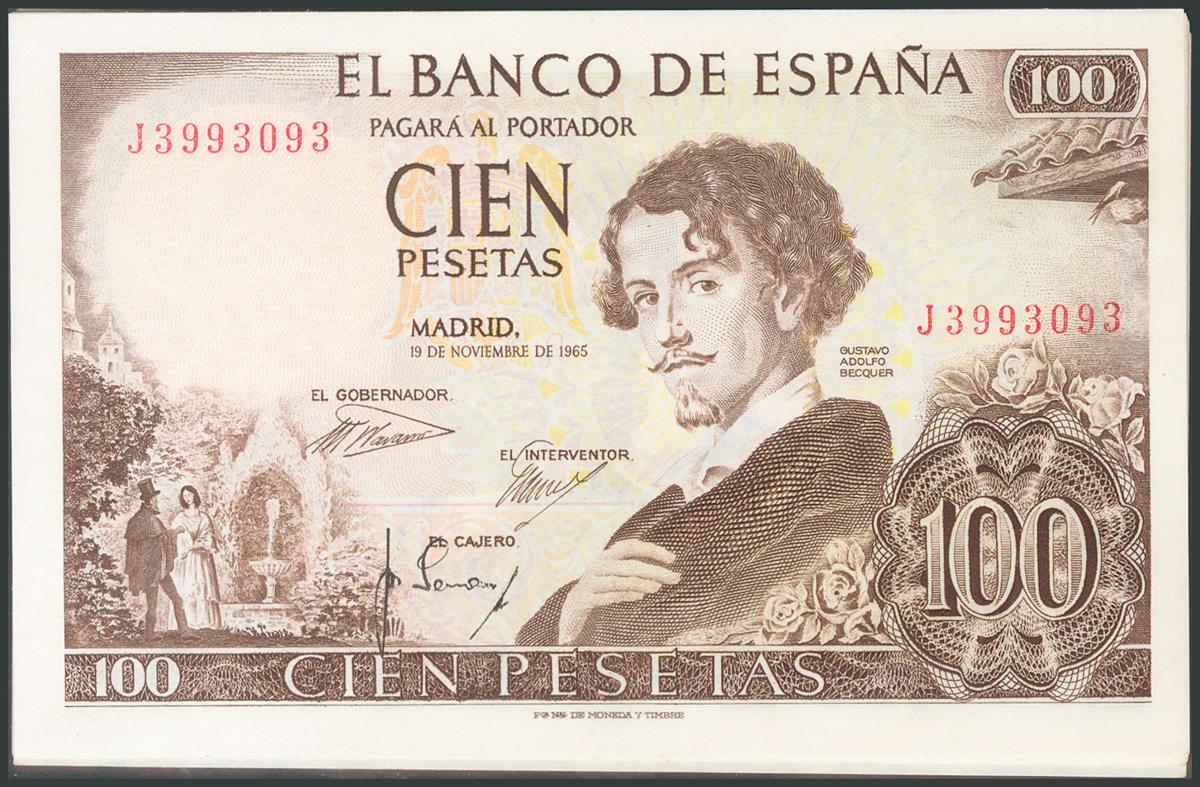 Conjunto de 8 billetes correlativos de 100 Pesetas emitidos el 19 de Noviembre de 1965, todos con la serie J. (Edifil 2017: 470a). SC/SC-.
