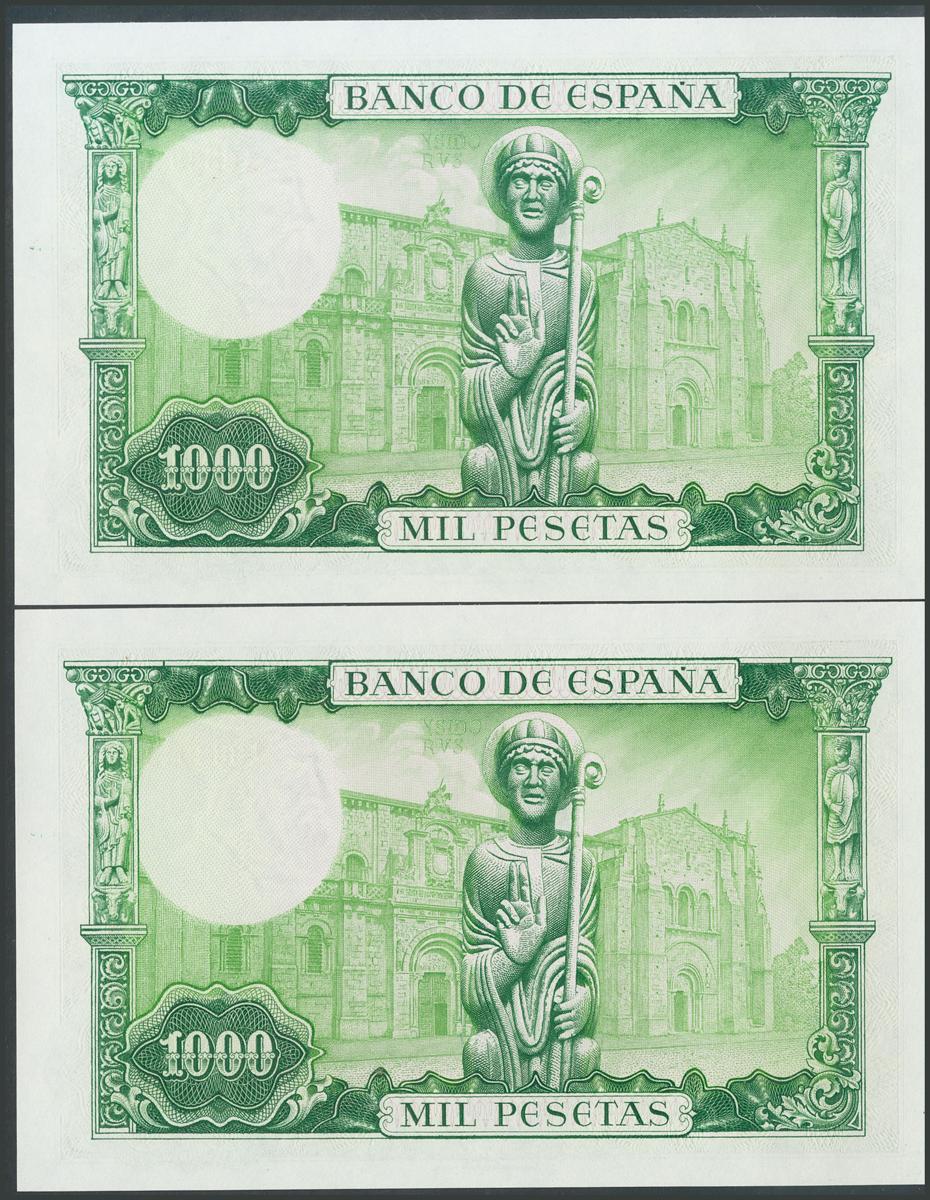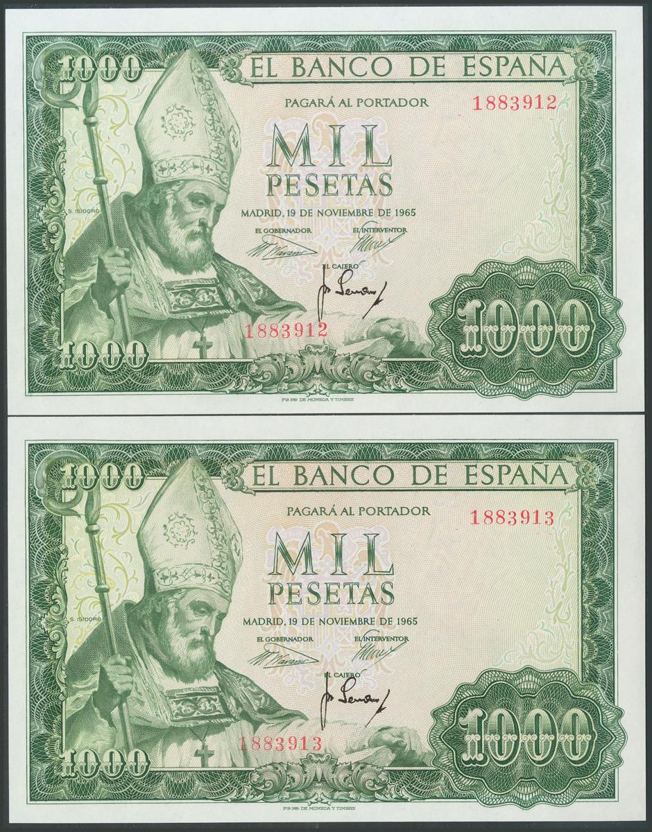 1000 Pesetas. 19 de Noviembre de 1965. Pareja correlativa. Sin serie. (Edifil 2017: 471). Apresto original. SC/SC-.