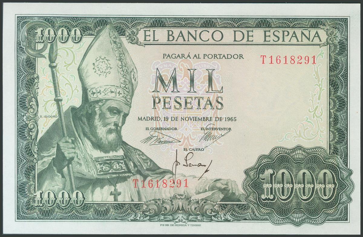 1000 Pesetas. 19 de Noviembre de 1965. Serie T. (Edifil 2017: 471b). Apresto original. SC.