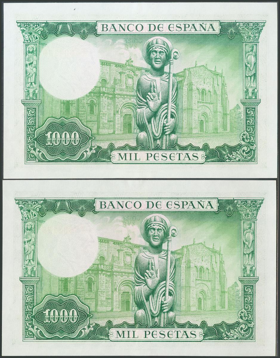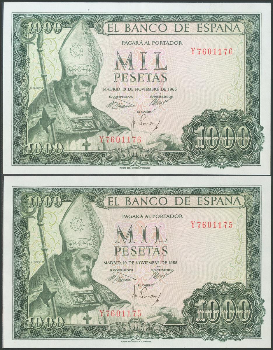 1000 Pesetas. 19 de Noviembre de 1965. Pareja correlativa. Serie Y. (Edifil 2017: 471b). Conserva parte del apresto original. SC-.