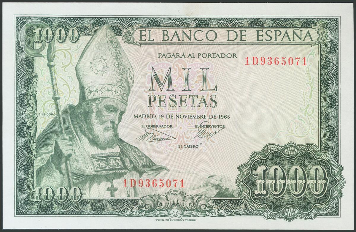 1000 Pesetas. 19 de Noviembre de 1965. Serie 1D y sin firma del cajero. (Edifil 2017: 471b). SC.