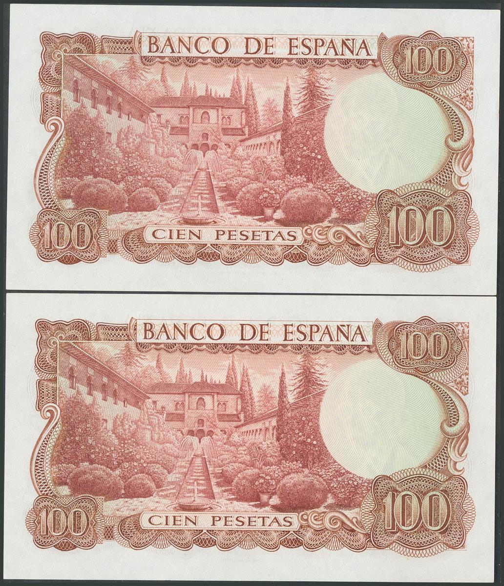100 Pesetas. 17 de Noviembre de 1970. Pareja correlativa. Sin serie. (Edifil 2017: 472). Apresto original. SC-.