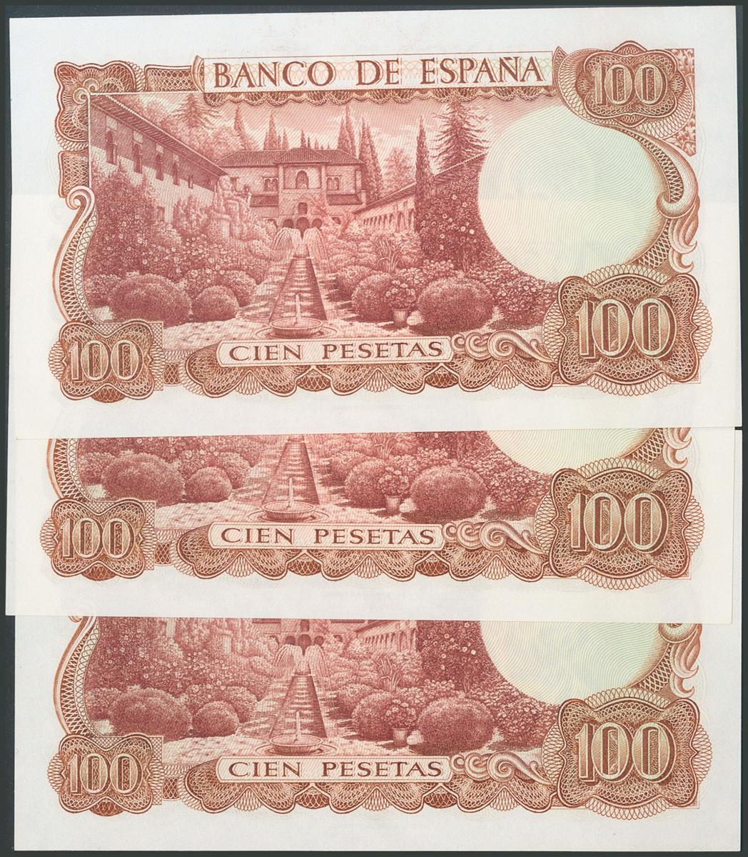 100 Pesetas. 17 de Noviembre de 1970. Trío correlativo. Serie A. (Edifil 2017: 472a). SC/SC-.