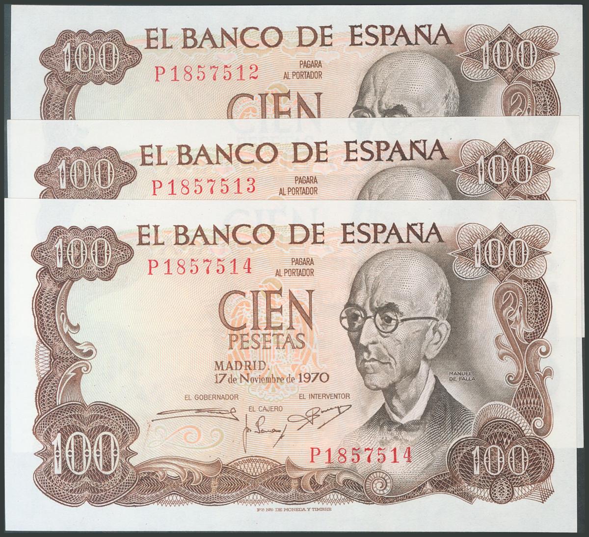 100 Pesetas. 17 de Noviembre de 1970. Trío correlativo. Serie P. (Edifil 2017: 472b). Apresto original. SC.
