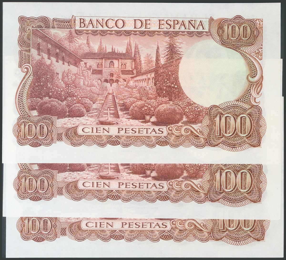 100 Pesetas. 17 de Noviembre de 1970. Trío correlativo. Serie P. (Edifil 2017: 472b). Apresto original. SC.