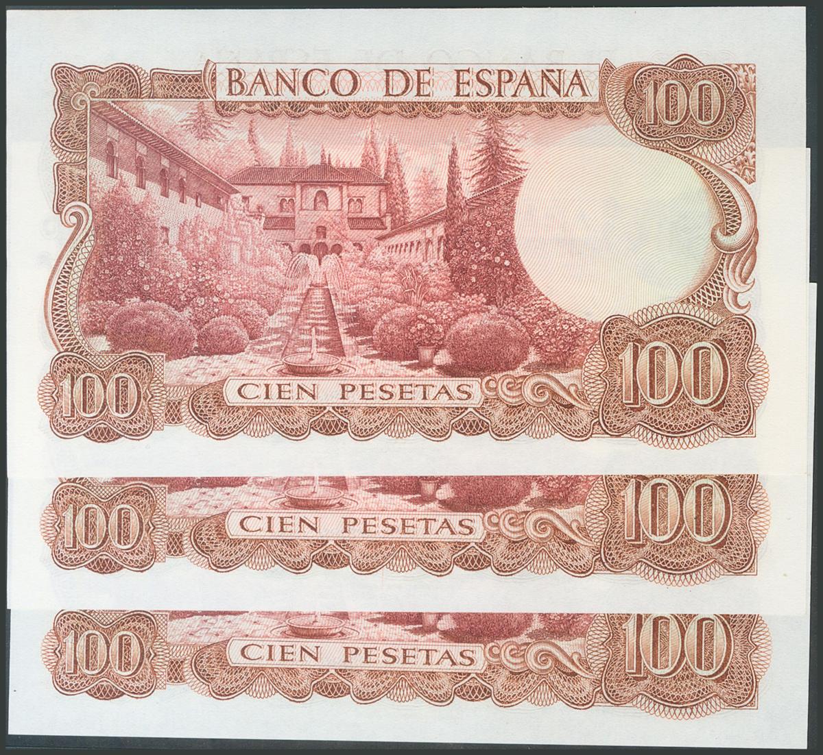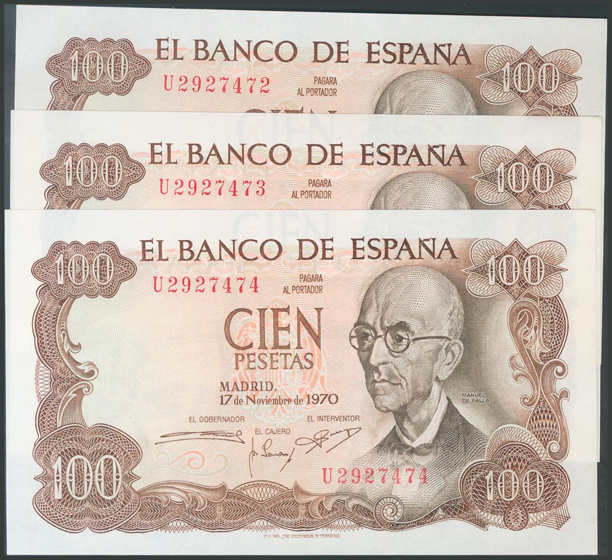 100 Pesetas. 17 de Noviembre de 1970. Trío correlativo. Serie U. (Edifil 2017: 472b). Apresto original. SC.