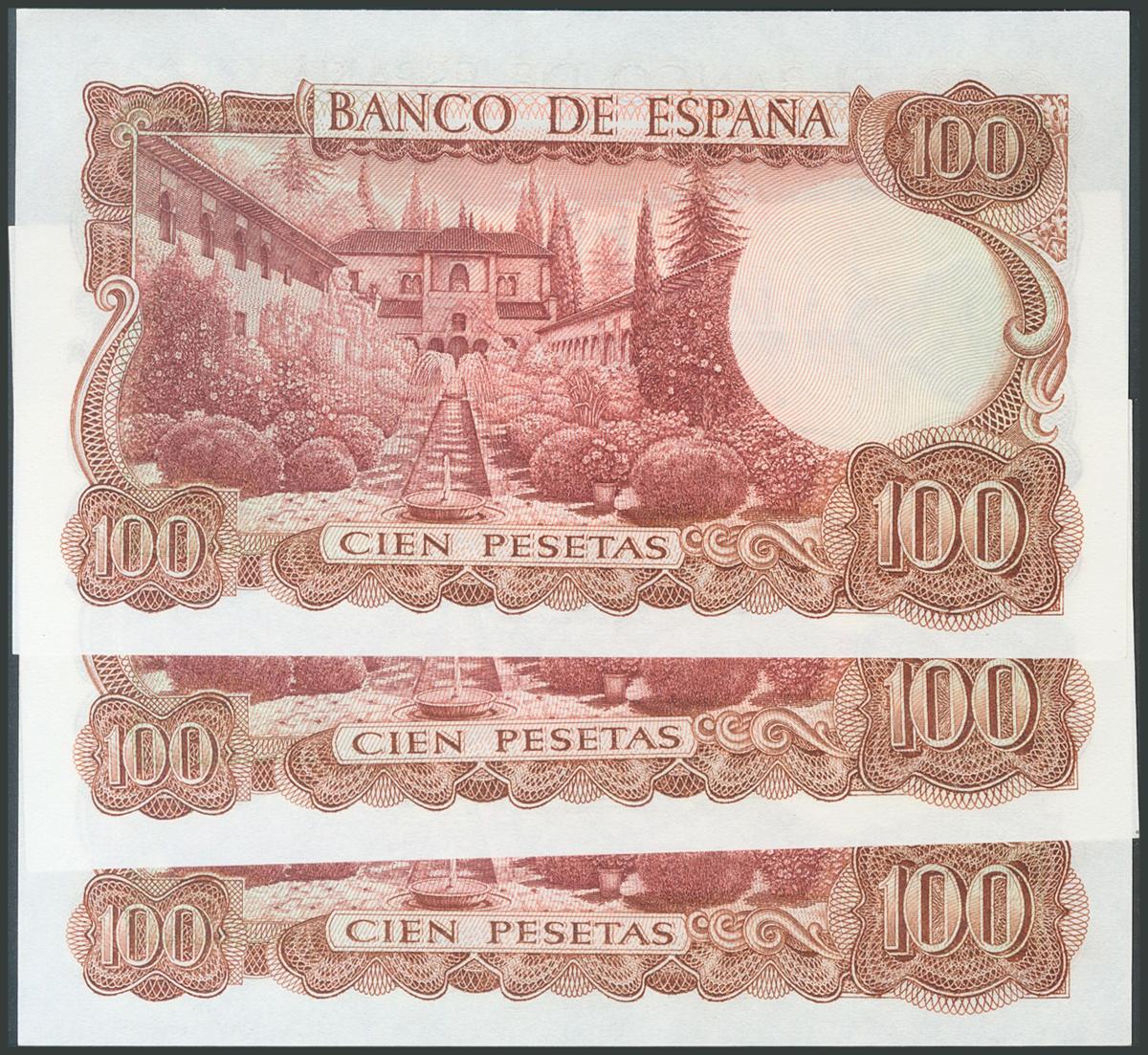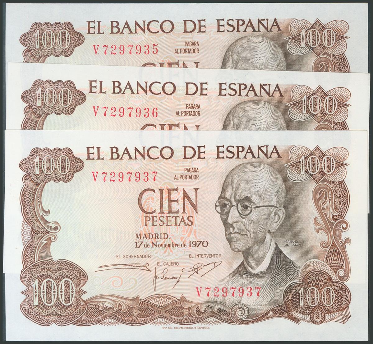 100 Pesetas. 17 de Noviembre de 1970. Trío correlativo. Serie V. (Edifil 2017: 472b). Apresto original. SC.