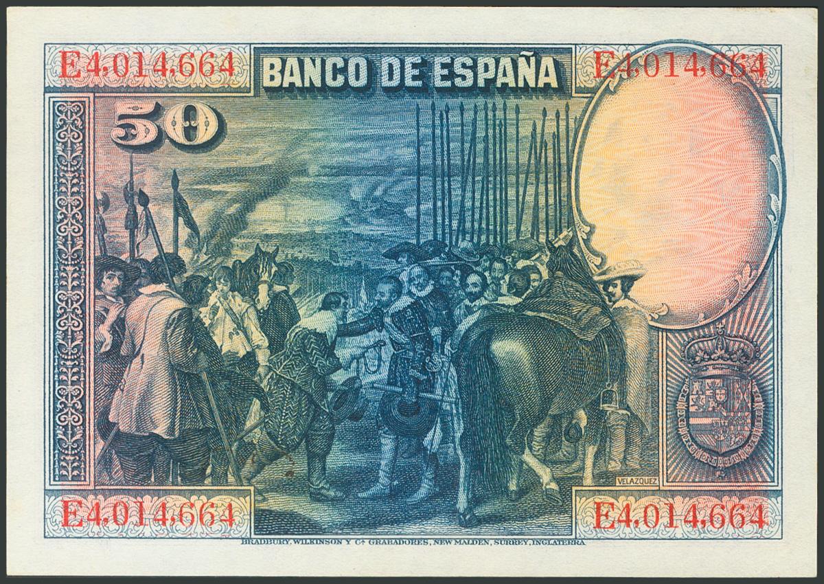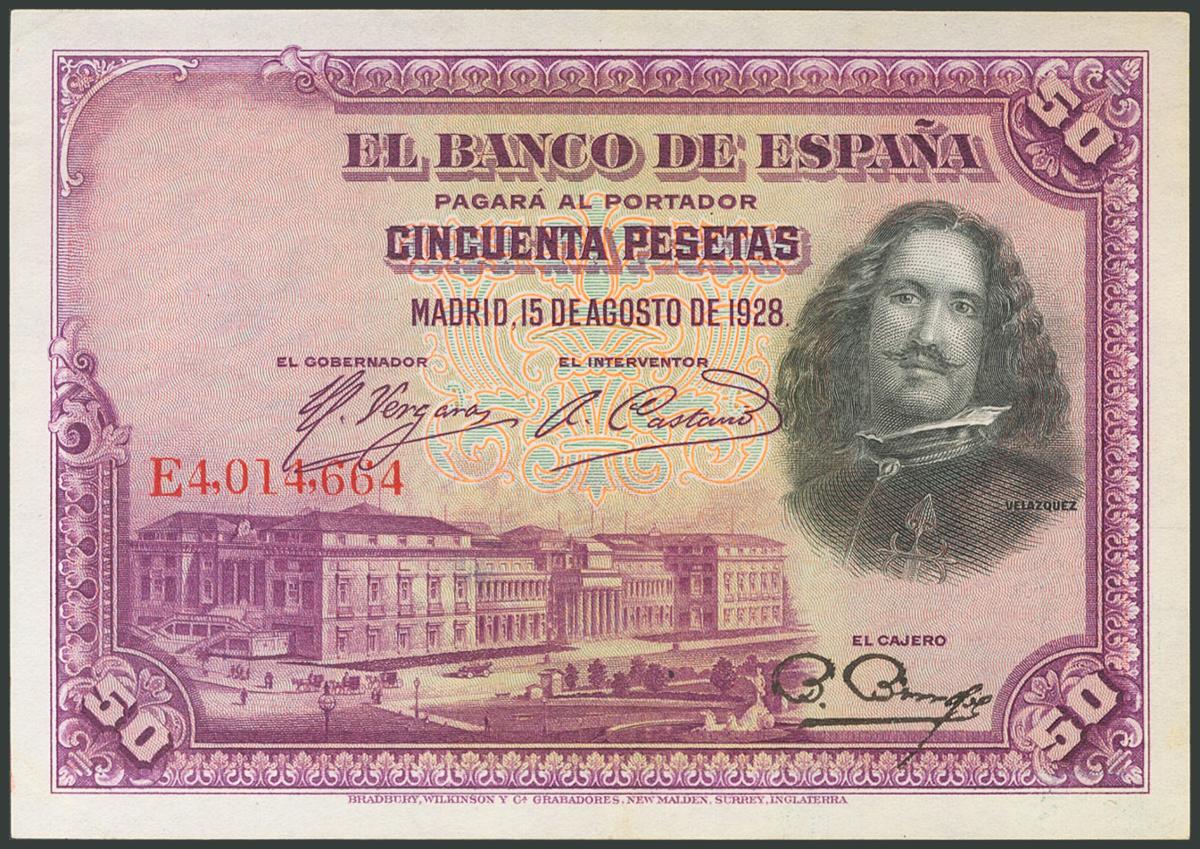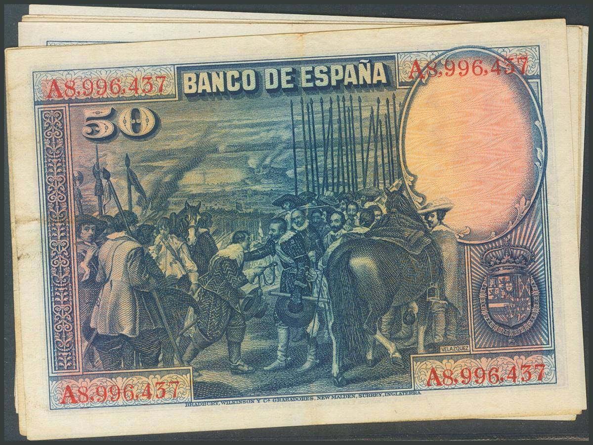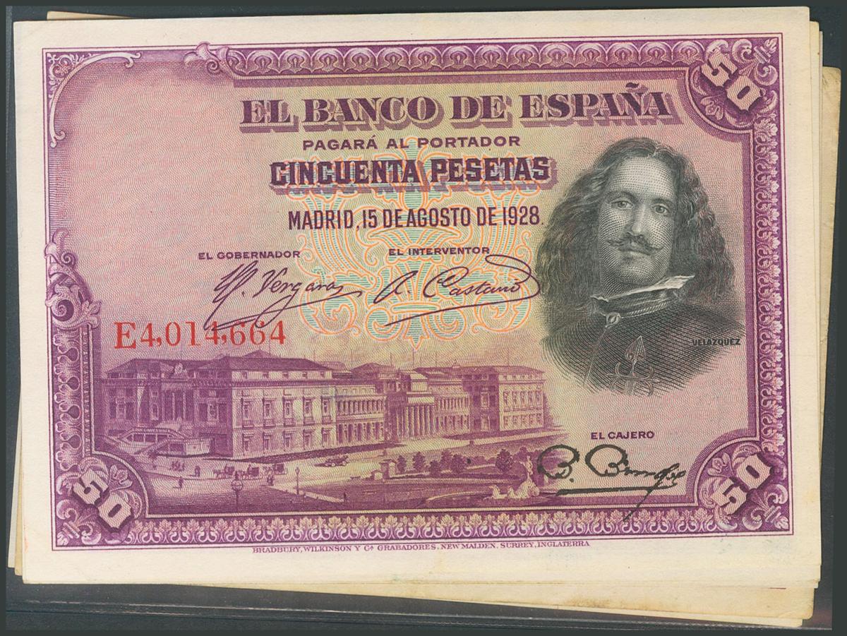 Conjunto de 6 billetes de 50 Pesetas emitidos el 15 de Agosto de 1928, con las series A, B, C, D y E y el sin serie. (Edifil 2017: 329, 354). SC-/MBC+.