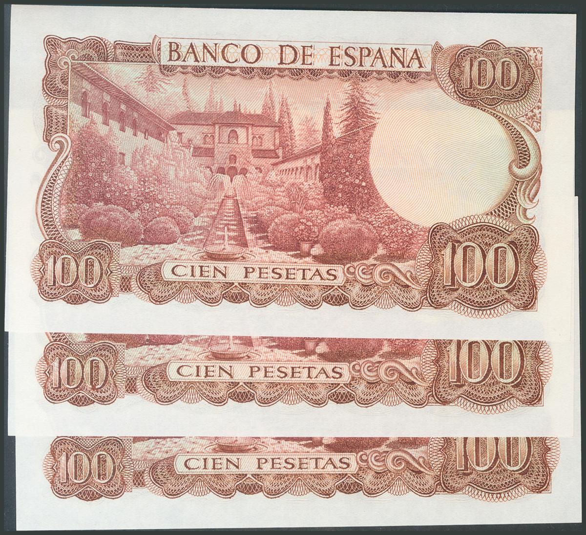 100 Pesetas. 17 de Noviembre de 1970. Trío correlativo. Serie Y. (Edifil 2017: 472b). Apresto original. SC.