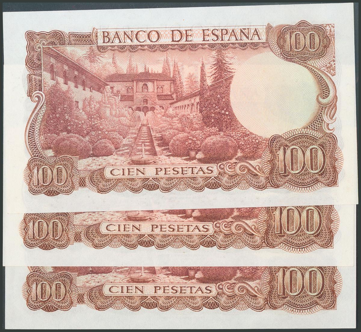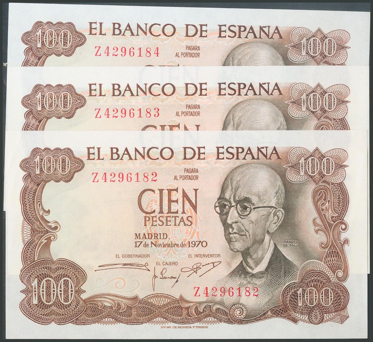 100 Pesetas. 17 de Noviembre de 1970. Trío correlativo. Serie Z. (Edifil 2017: 472b). Apresto original. SC.