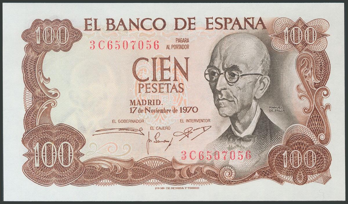 100 Pesetas. 17 de Noviembre de 1970. Serie 3C y numeración capicúa. (Edifil 2017: 472b). SC.