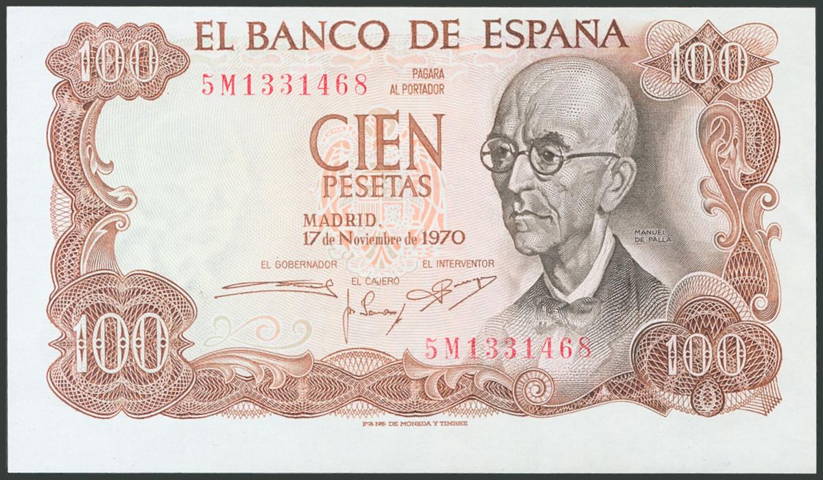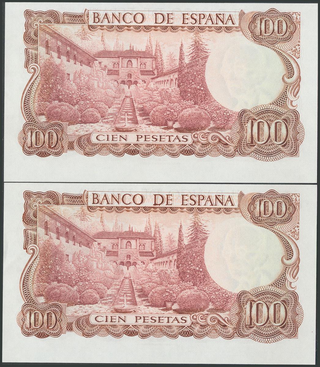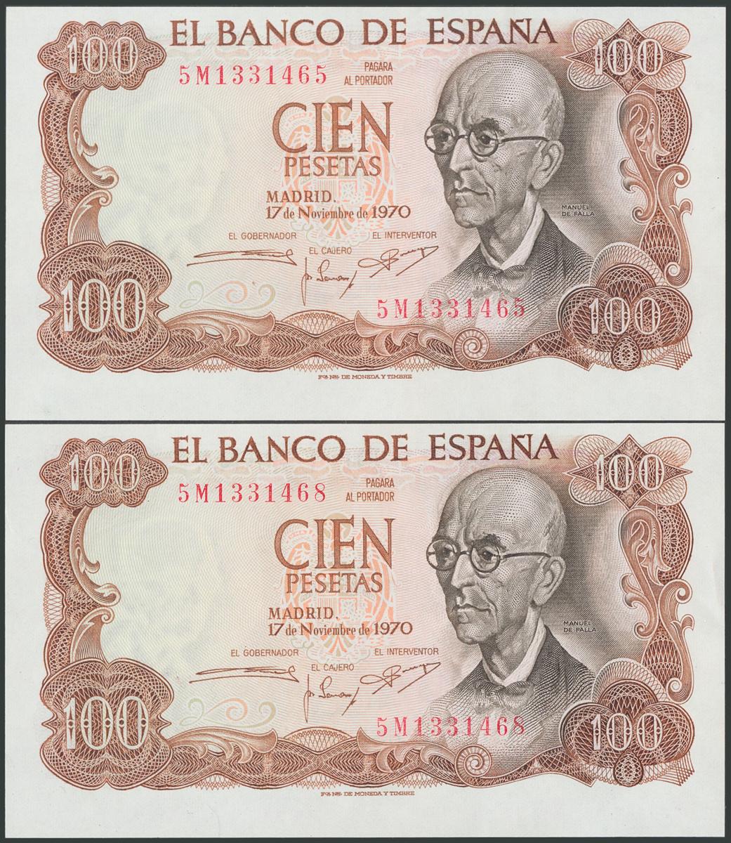 100 Pesetas. 17 de Noviembre de 1970. Pareja correlativa. Serie 5M. Ligera variedad de guillotinado. (Edifil 2017: 472c). Apresto original. SC.