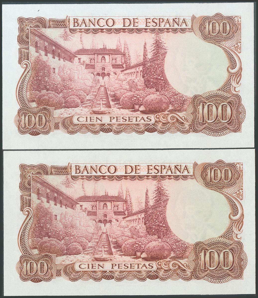 100 Pesetas. 17 de Noviembre de 1970. Pareja correlativa. Serie 6T. (Edifil 2017: 472c). SC.