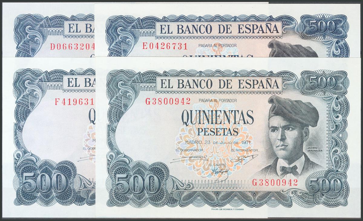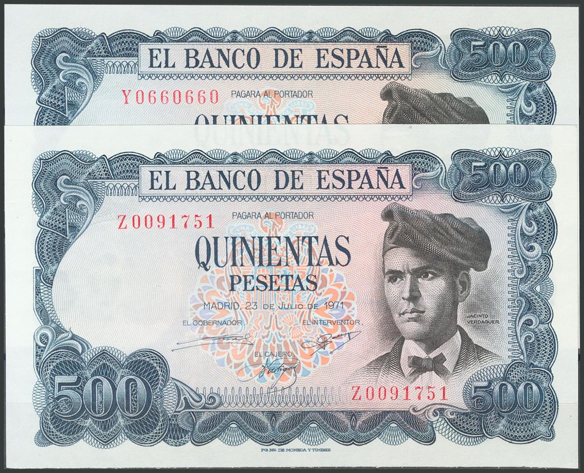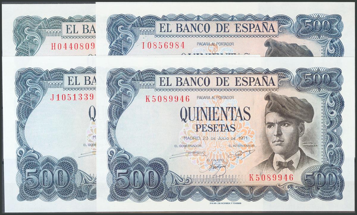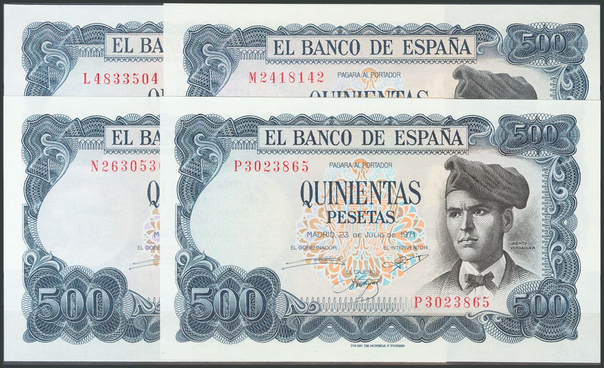 Precioso e interesante conjunto de 26 billetes de 500 Pesetas emitidos el 23 de Julio de 1971, incluyendo todas las letras y el sin serie capicúa de la primera emisión (A, B, C, D, E, F, G, H, I, J, K, L, M capicúa, N, P, Q capicúa, R, S, T, U, V, W capicúa, X, Y capicúa y Z). (Edifil 2017; 473, 473a). Muy raro conjunto y de muy buena calidad. Todos los billetes presentan apresto original. SC/SC-.