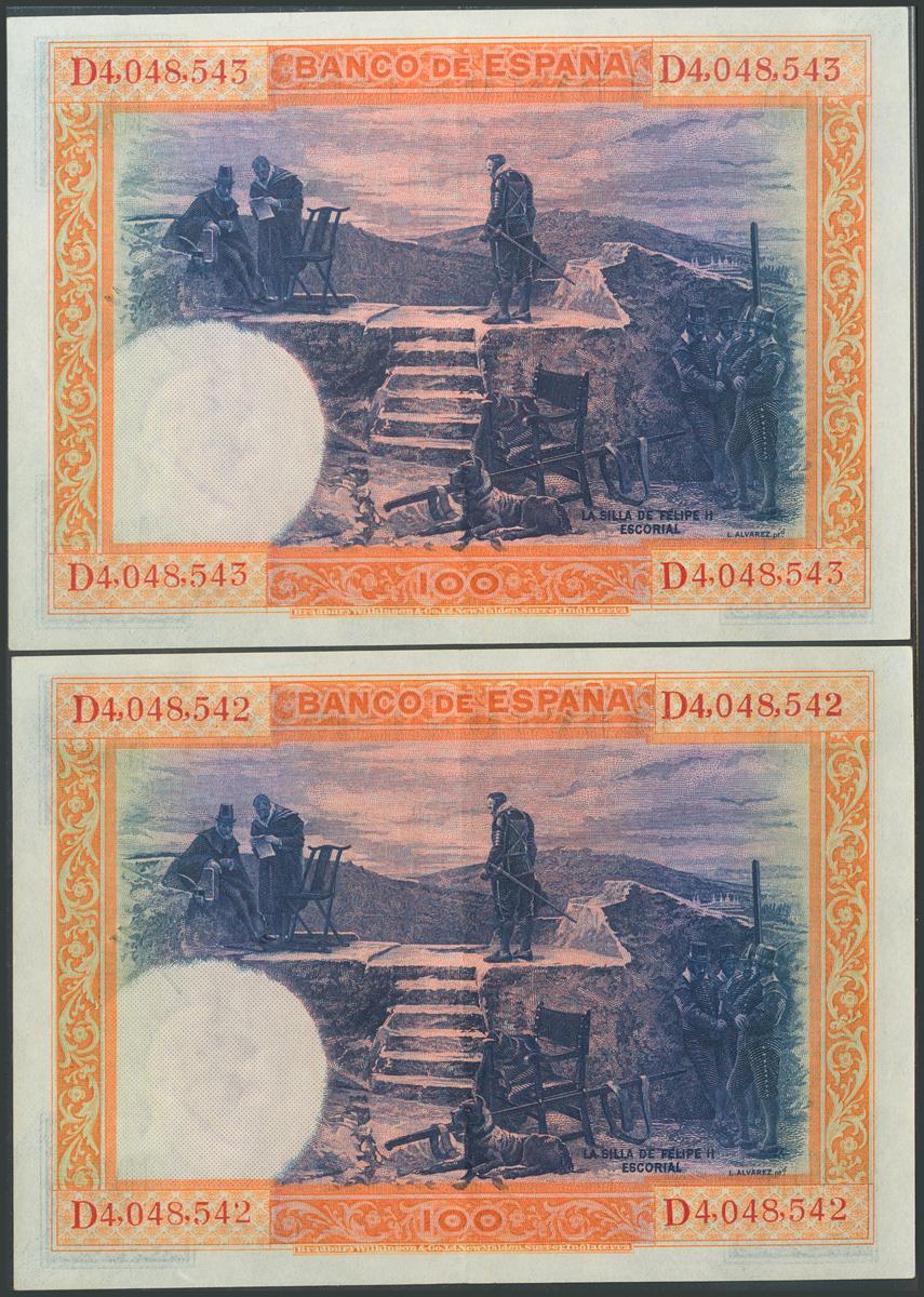 100 Pesetas. 1 de Julio de 1925. Pareja correlativa. Serie D. (Edifil 2017: 350). EBC.