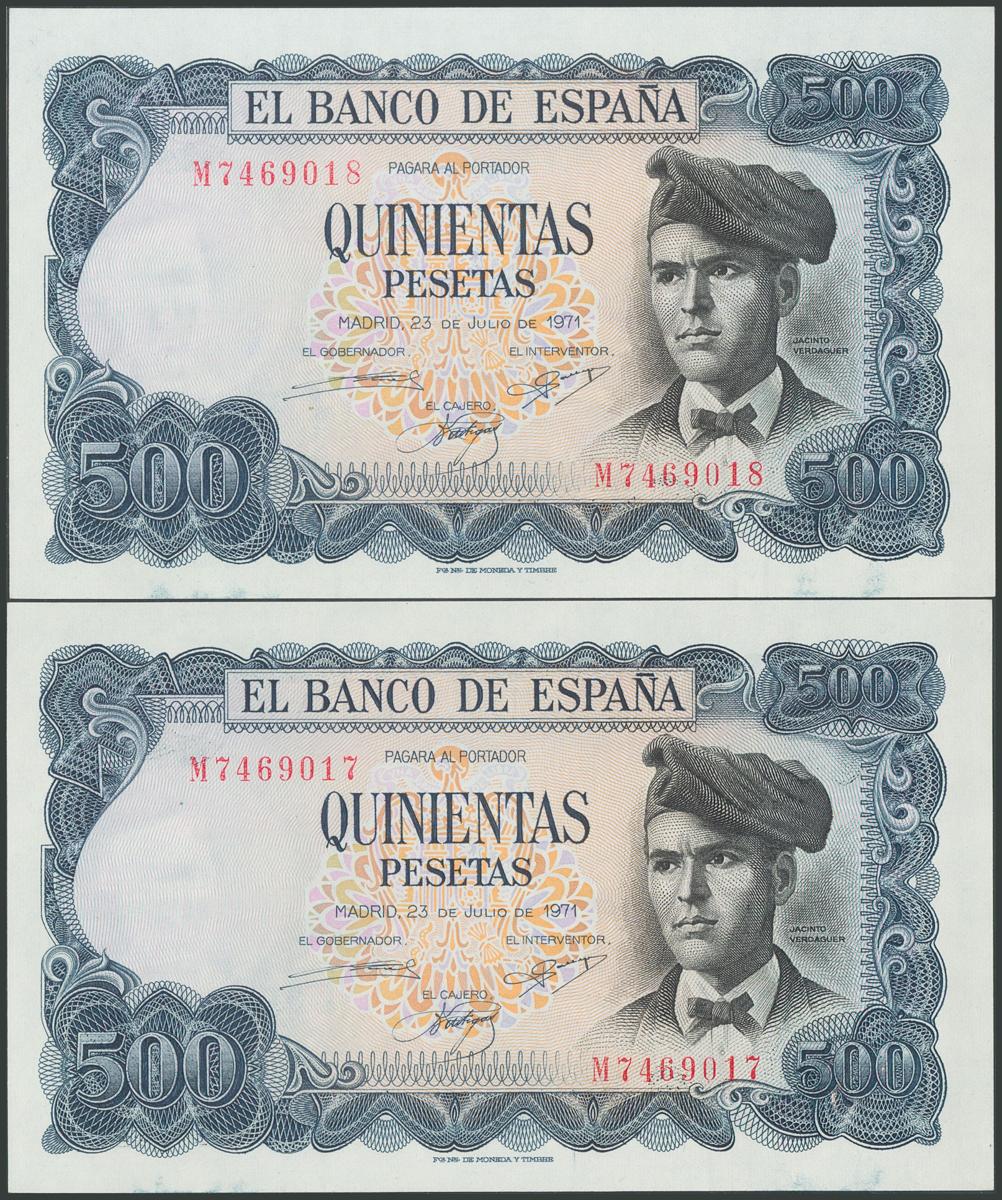 500 Pesetas. 23 de julio de 1971. Pareja correlativa. Serie M. (Edifil 2017: 473a). SC.