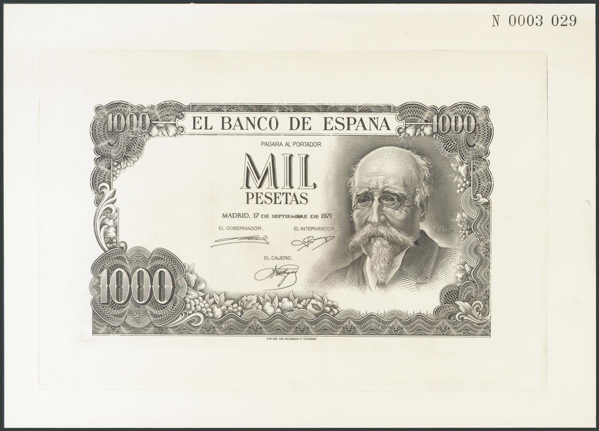 Prueba definitiva en color negro del billete de 1000 Pesetas emitido el 17 de Septiembre de 1971, con numeración N0003029 (la tipografía del numerador es la típica de los proyectos de la FNMT de los años 80 y 90). (Edifil 2017: 474P). Pieza de enorme espectacularidad y rareza.