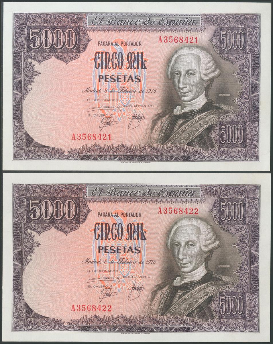5000 Pesetas. 6 de Febrero de 1976. Pareja correlativa. Serie A. (Edifil 2017: 475a). Conserva todo su apresto original. SC-.