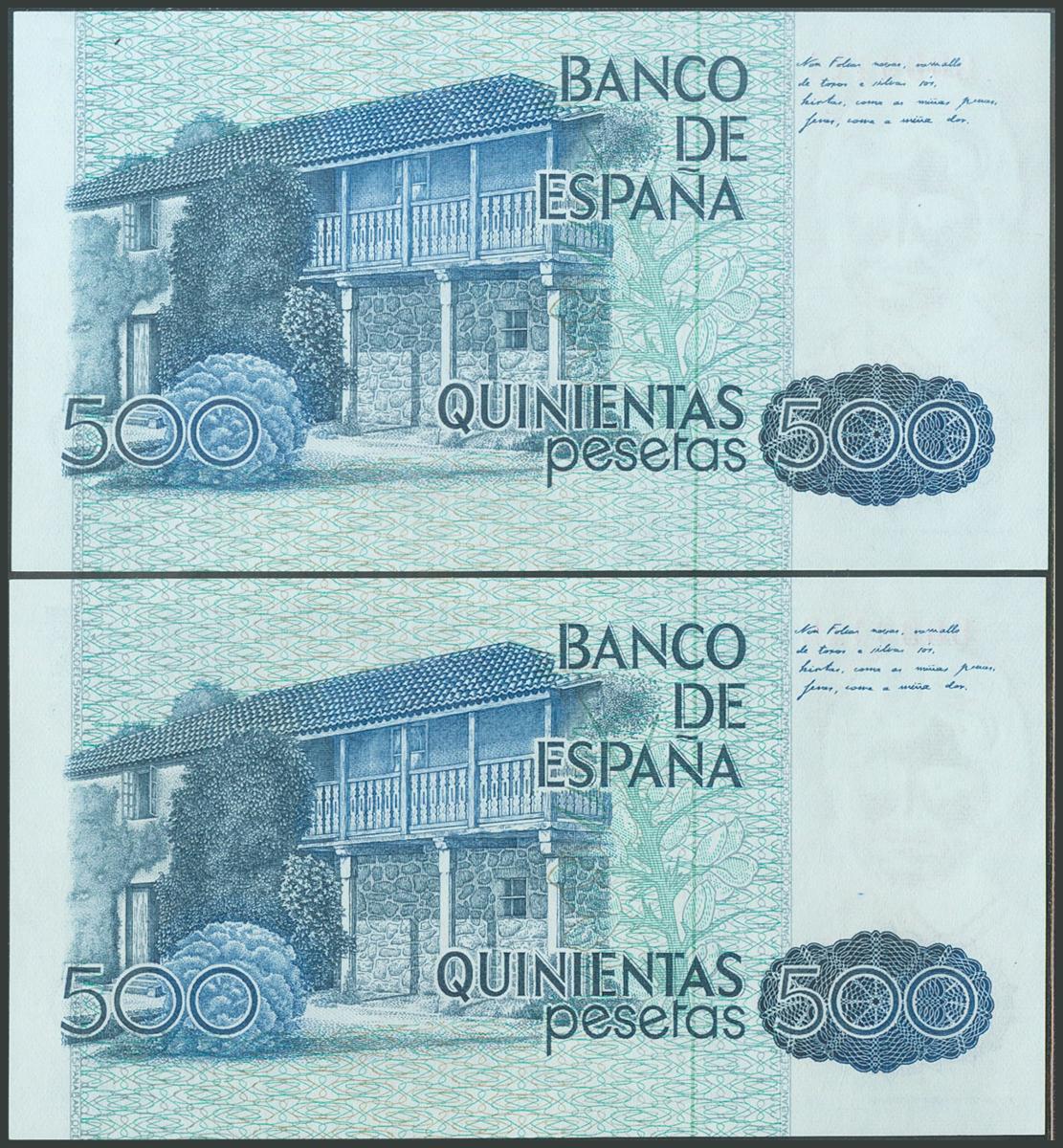500 Pesetas. 23 de Octubre de 1979. Pareja correlativa. Sin serie y bajísima numeración. (Edifil 2017: 476). SC.