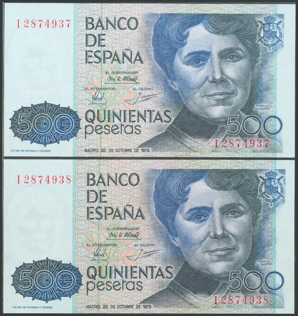 500 Pesetas. 23 de Octubre de 1979. Pareja correlativa. Serie I. (Edifil 2017: 476a). SC.